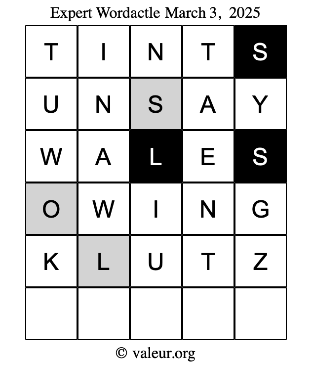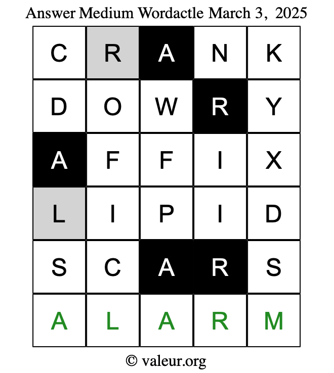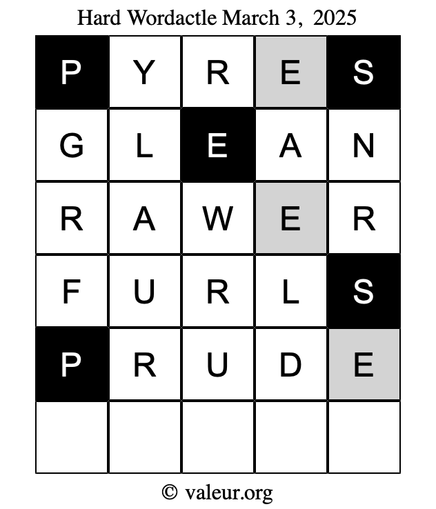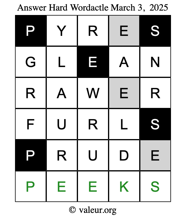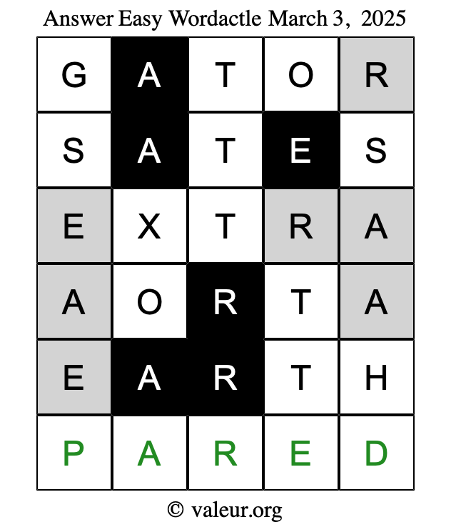 Here are the March 3, 2025 daily four Wordactle puzzles. You are welcome to print a copy of the puzzles and solve them by hand. For your convenience, we have also included the solutions further down the page so you can check your work.
