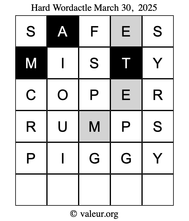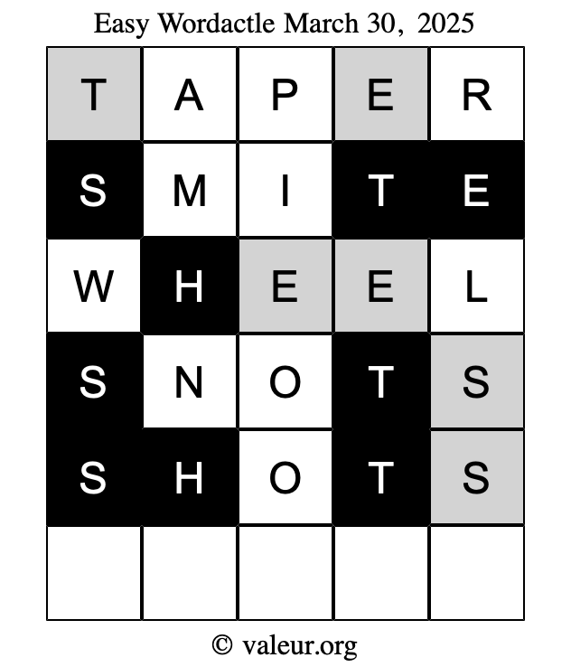 Here are the March 30, 2025 daily four Wordactle puzzles. You are welcome to print a copy of the puzzles and solve them by hand. For your convenience, we have also included the solutions further down the page so you can check your work.