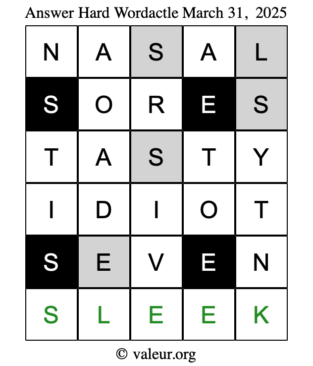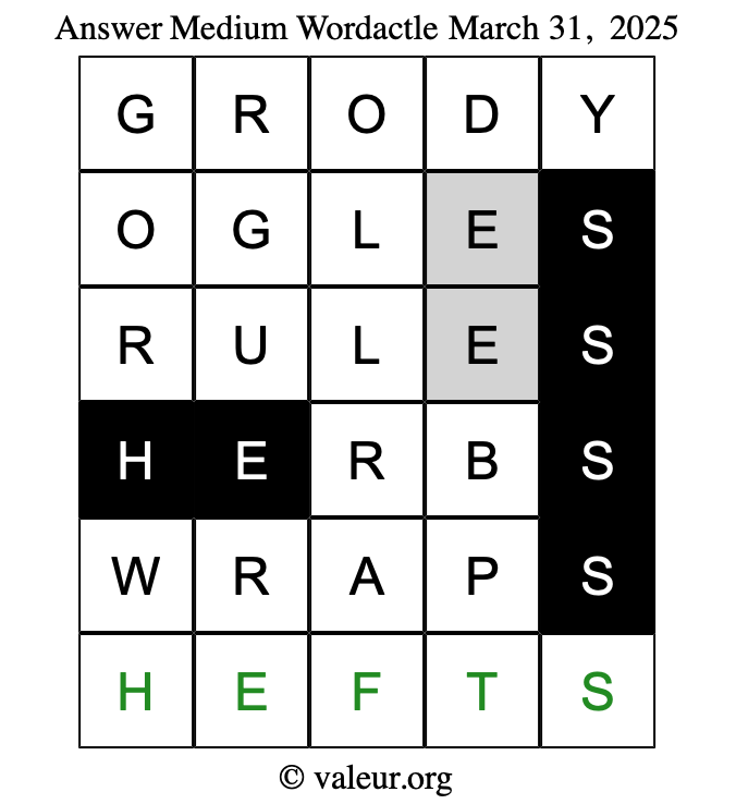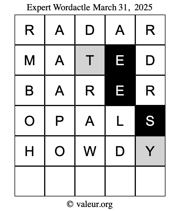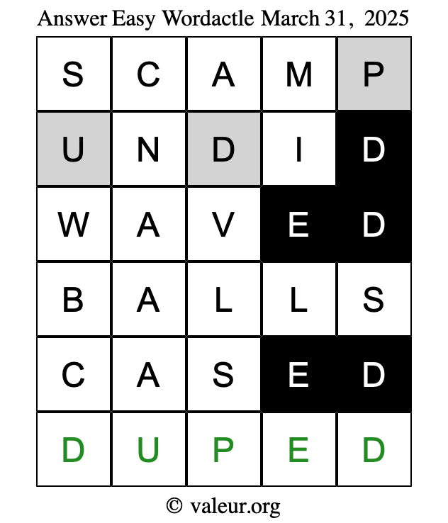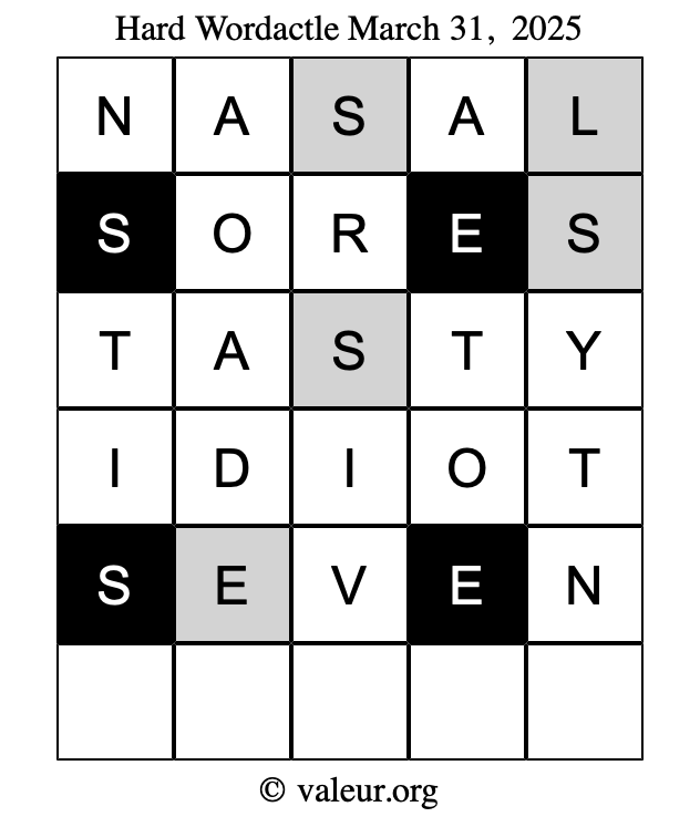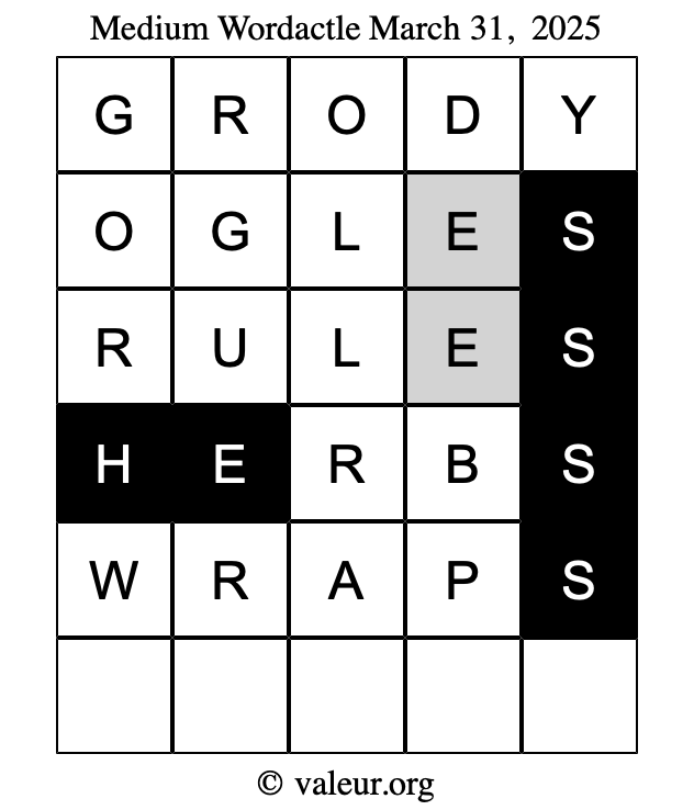Here are the March 31, 2025 daily four Wordactle puzzles. You are welcome to print a copy of the puzzles and solve them by hand. For your convenience, we have also included the solutions further down the page so you can check your work.
