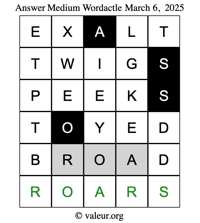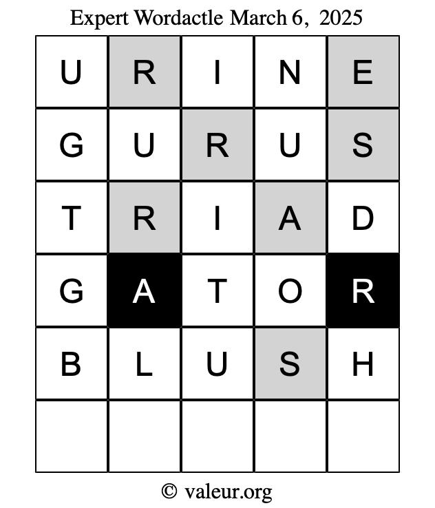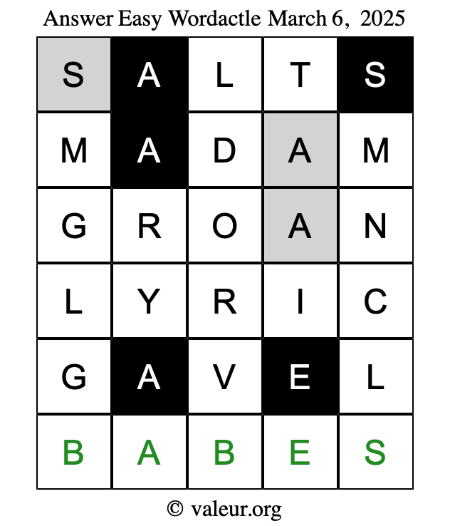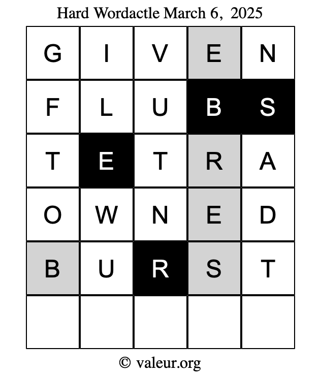 Here are the March 6, 2025 daily four Wordactle puzzles. You are welcome to print a copy of the puzzles and solve them by hand. For your convenience, we have also included the solutions further down the page so you can check your work.