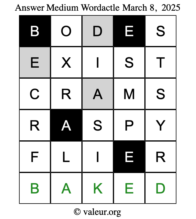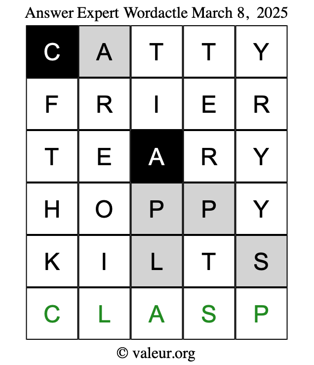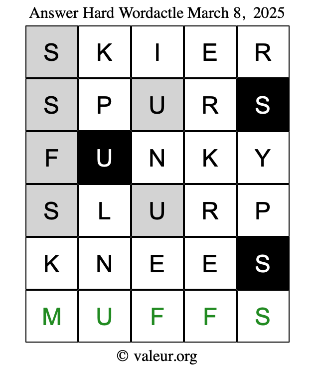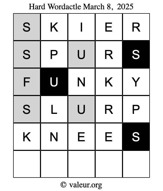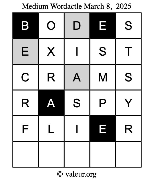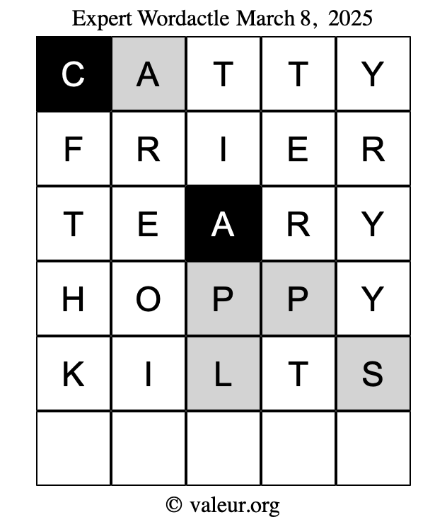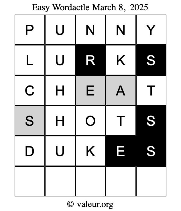 Here are the March 8, 2025 daily four Wordactle puzzles. You are welcome to print a copy of the puzzles and solve them by hand. For your convenience, we have also included the solutions further down the page so you can check your work.
