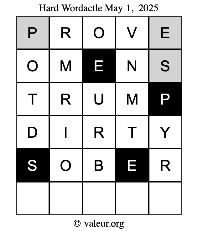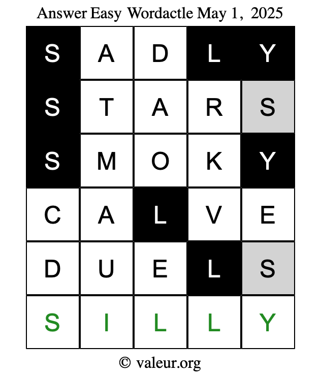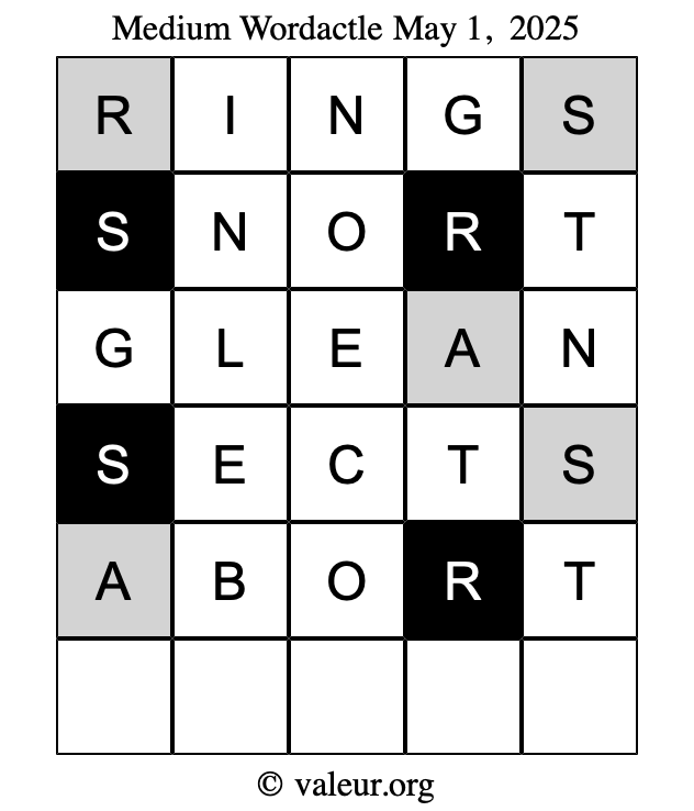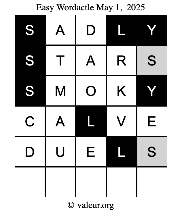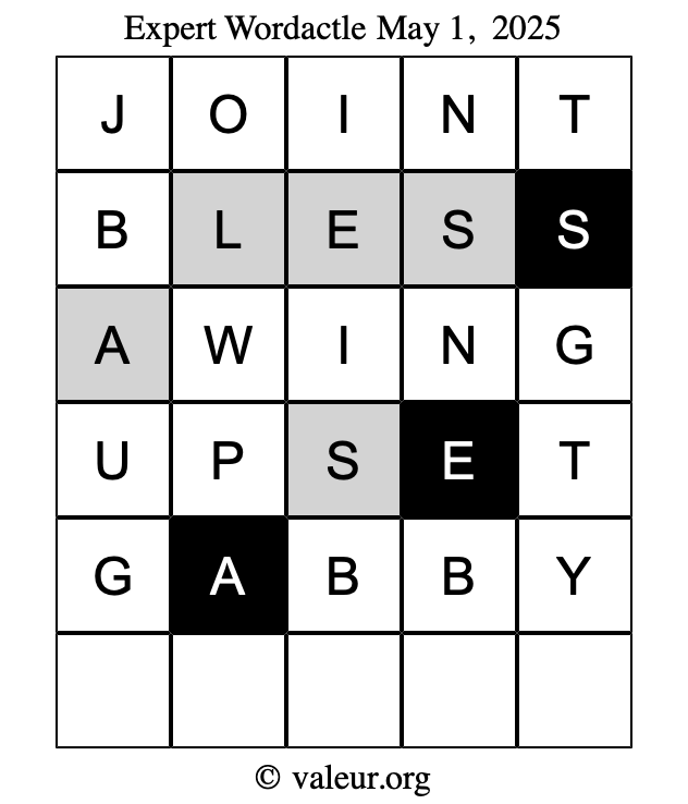 Here are the May 1, 2025 daily four Wordactle puzzles. You are welcome to print a copy of the puzzles and solve them by hand. For your convenience, we have also included the solutions further down the page so you can check your work.