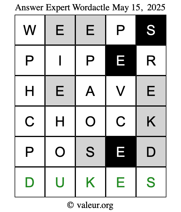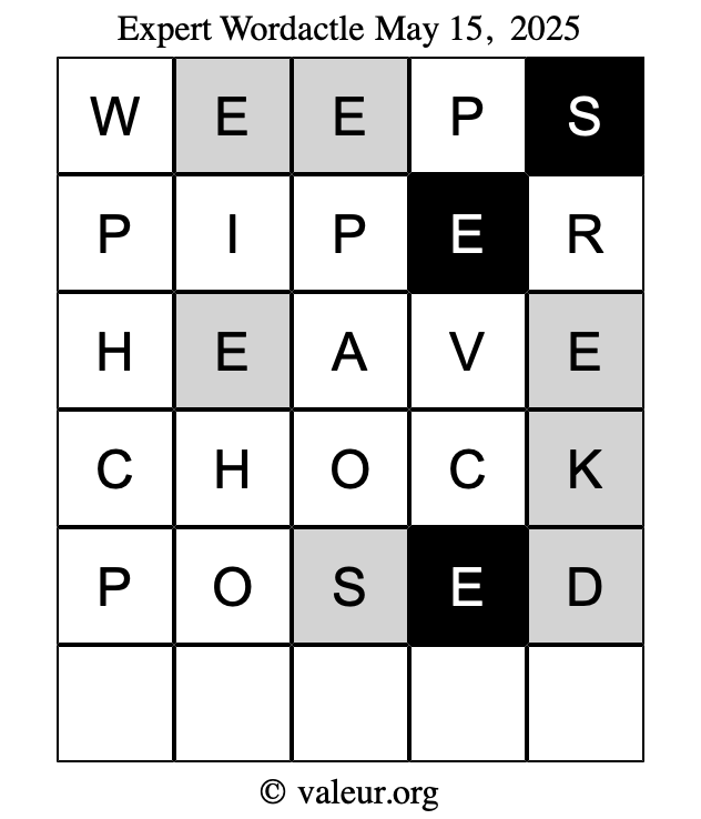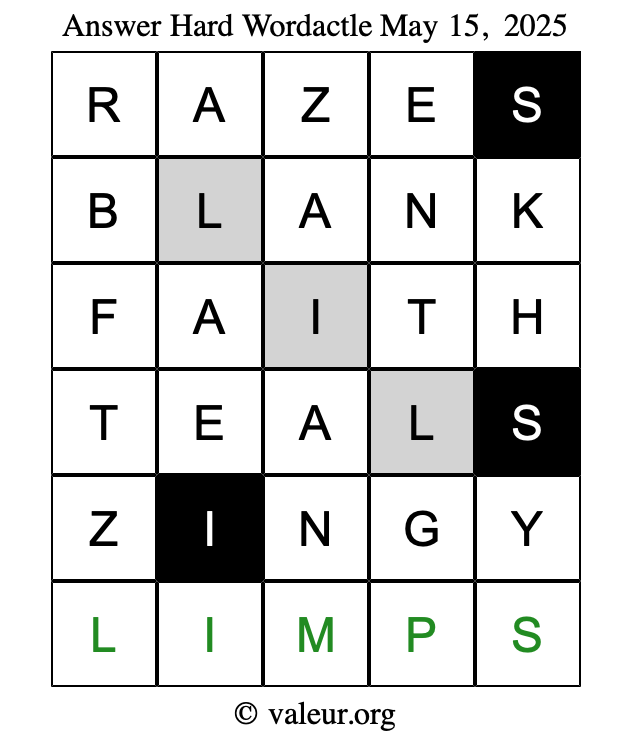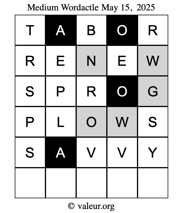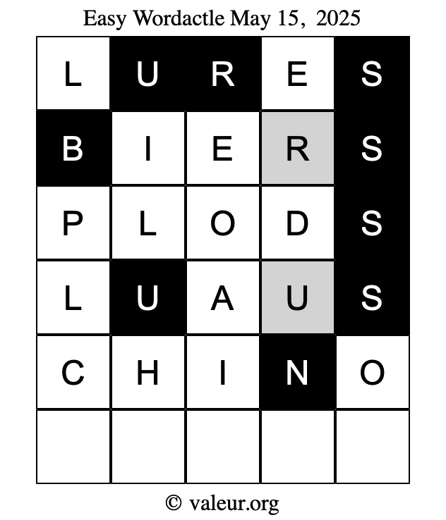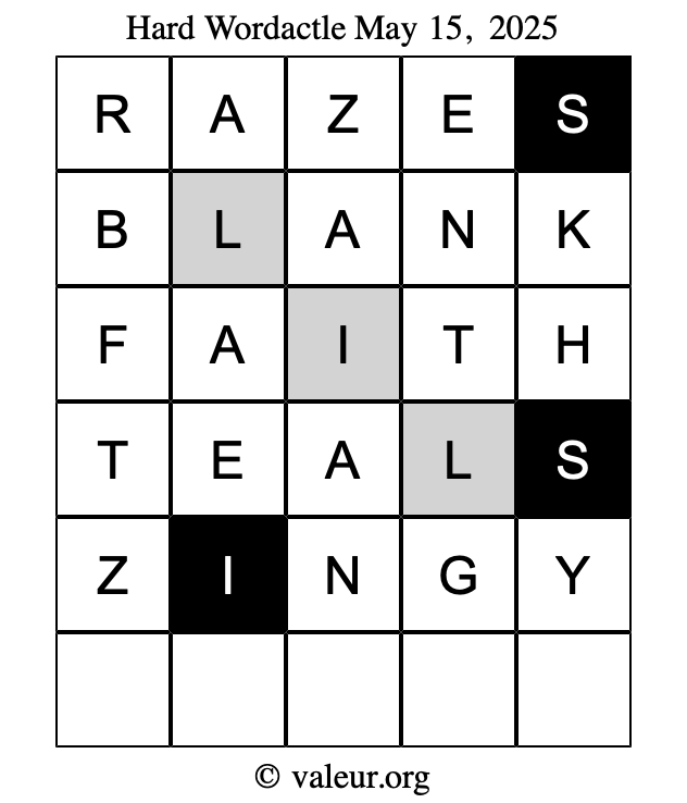 Here are the May 15, 2025 daily four Wordactle puzzles. You are welcome to print a copy of the puzzles and solve them by hand. For your convenience, we have also included the solutions further down the page so you can check your work.