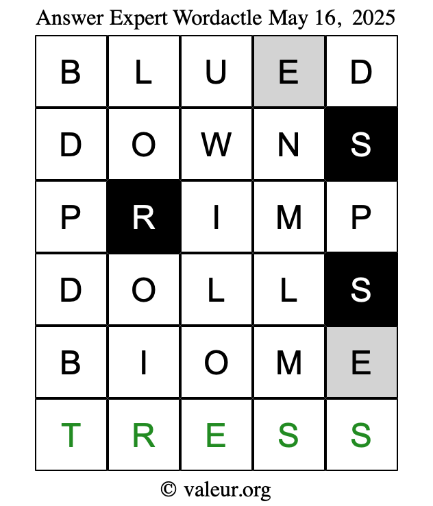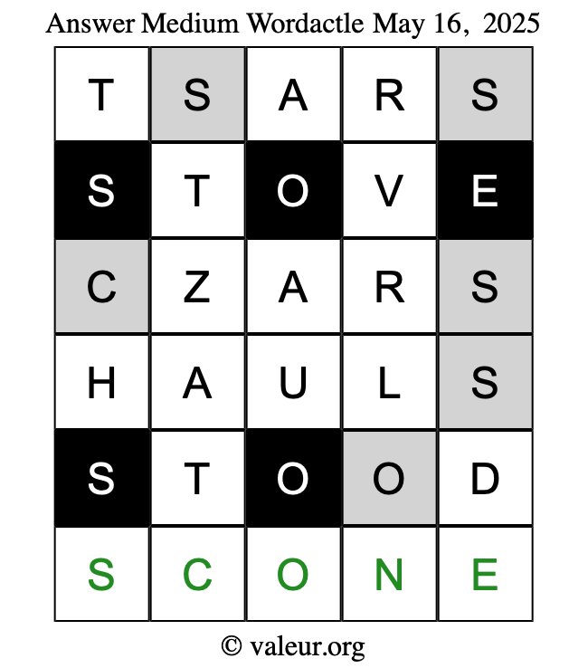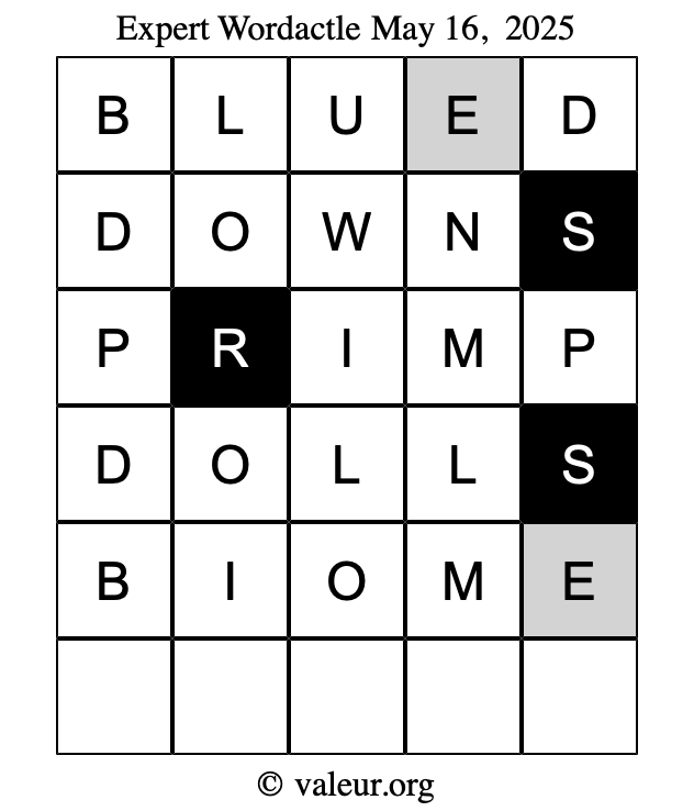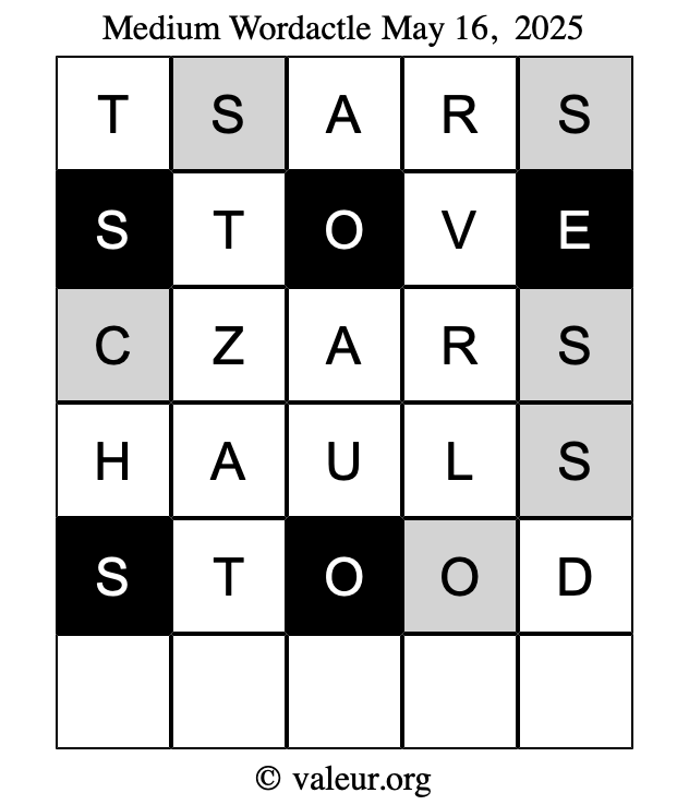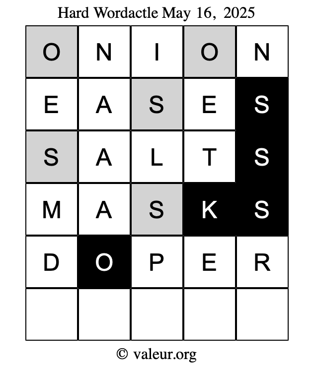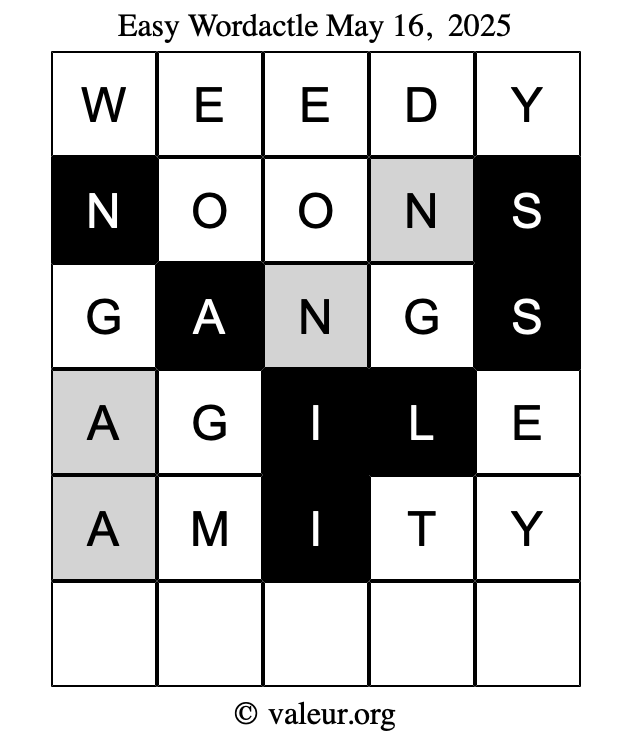 Here are the May 16, 2025 daily four Wordactle puzzles. You are welcome to print a copy of the puzzles and solve them by hand. For your convenience, we have also included the solutions further down the page so you can check your work.