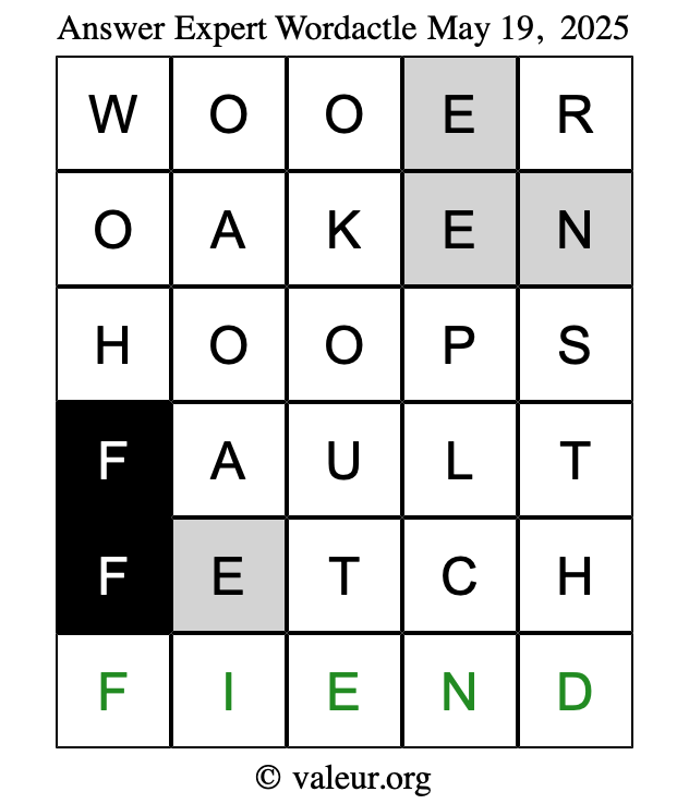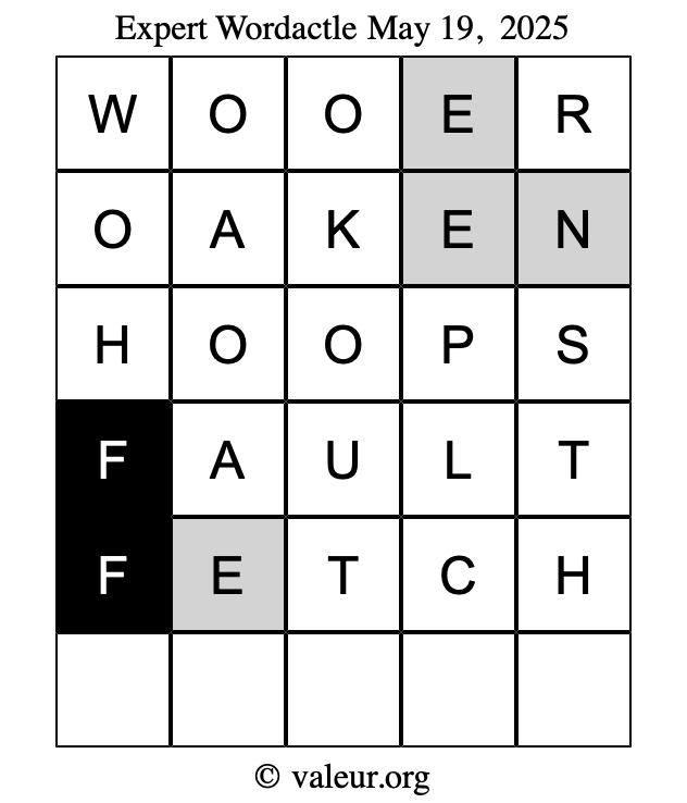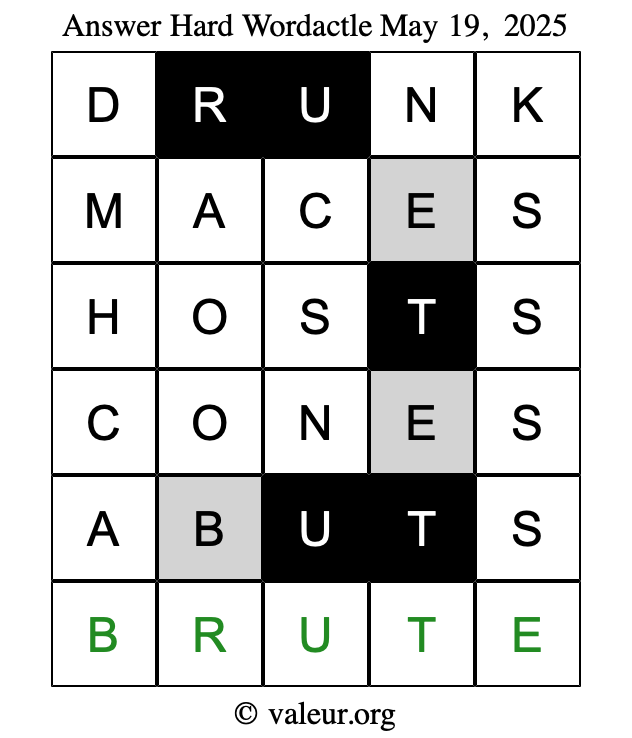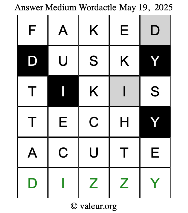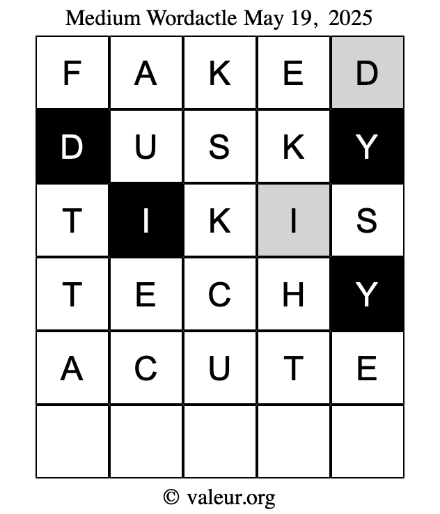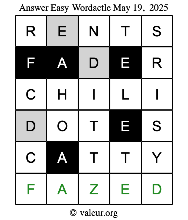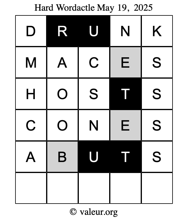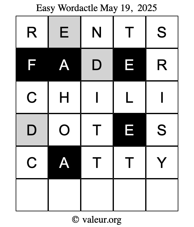 Here are the May 19, 2025 daily four Wordactle puzzles. You are welcome to print a copy of the puzzles and solve them by hand. For your convenience, we have also included the solutions further down the page so you can check your work.