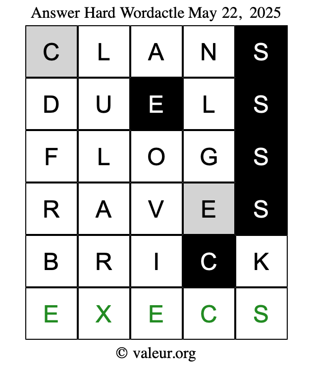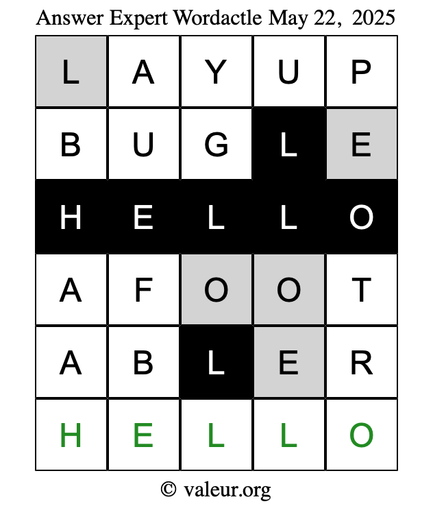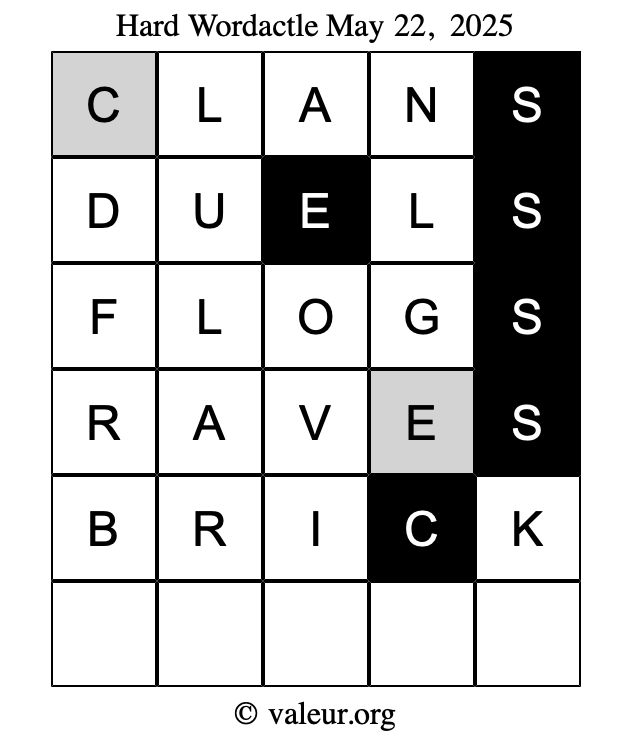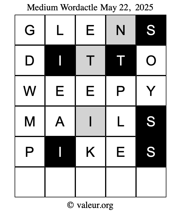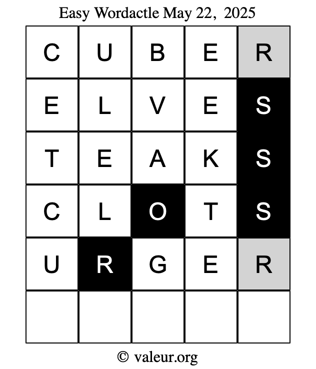 Here are the May 22, 2025 daily four Wordactle puzzles. You are welcome to print a copy of the puzzles and solve them by hand. For your convenience, we have also included the solutions further down the page so you can check your work.