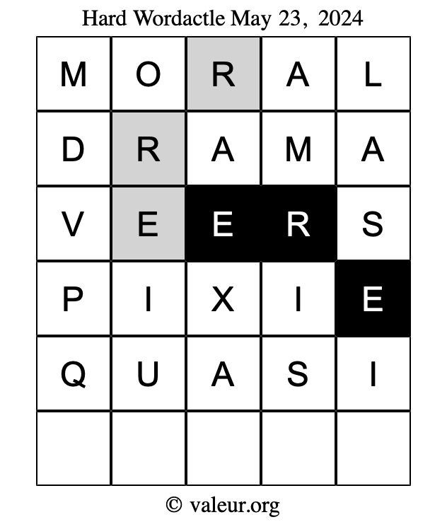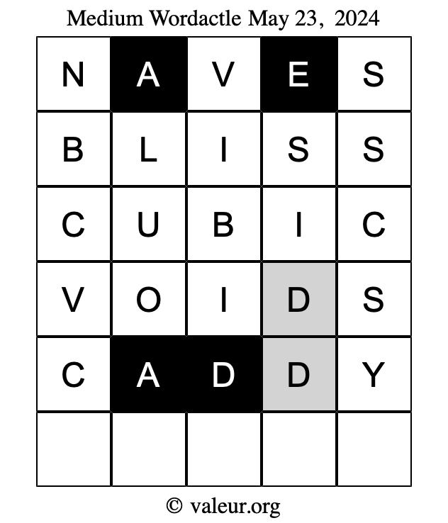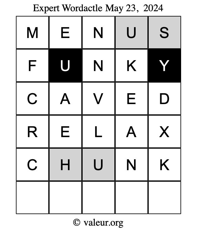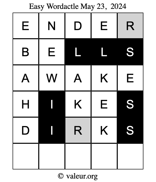 Here are the May 23, 2024 daily four Wordactle puzzles. You are welcome to print a copy of the puzzles and solve them by hand. For your convenience, we have also included the solutions further down the page so you can check your work.