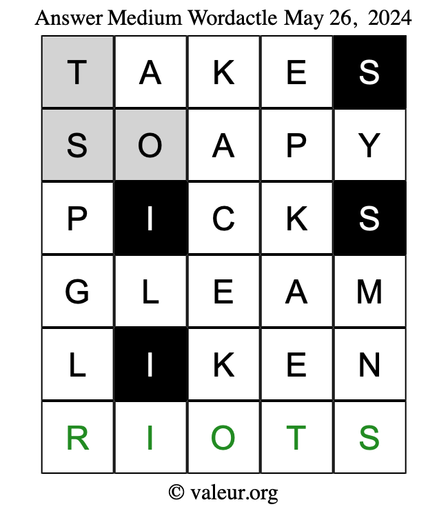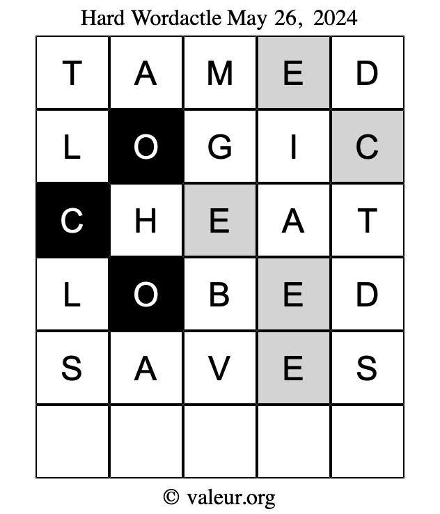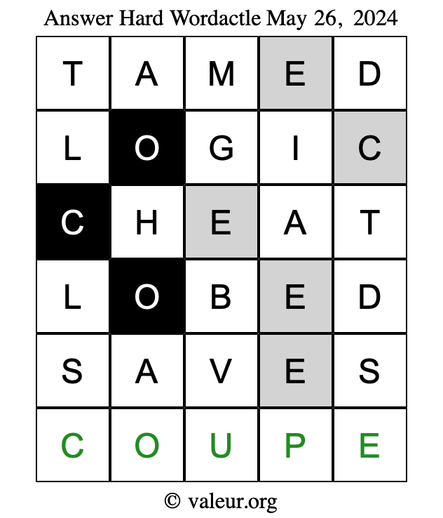 Here are the May 26, 2024 daily four Wordactle puzzles. You are welcome to print a copy of the puzzles and solve them by hand. For your convenience, we have also included the solutions further down the page so you can check your work.