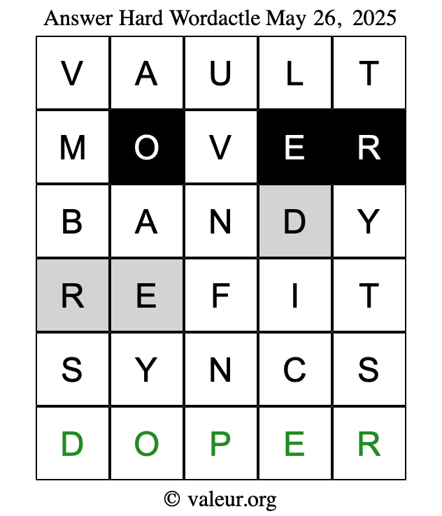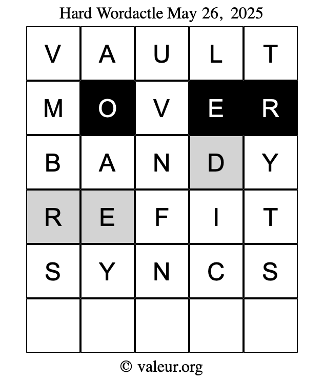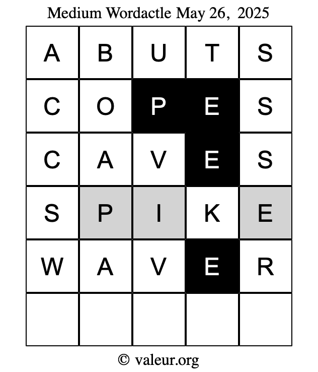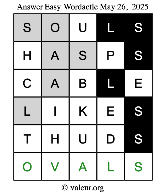Here are the May 26, 2025 daily four Wordactle puzzles. You are welcome to print a copy of the puzzles and solve them by hand. For your convenience, we have also included the solutions further down the page so you can check your work.