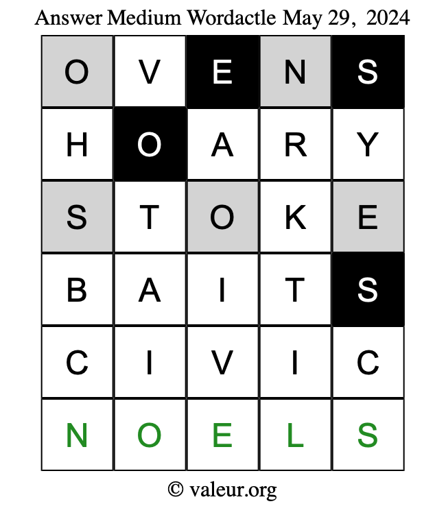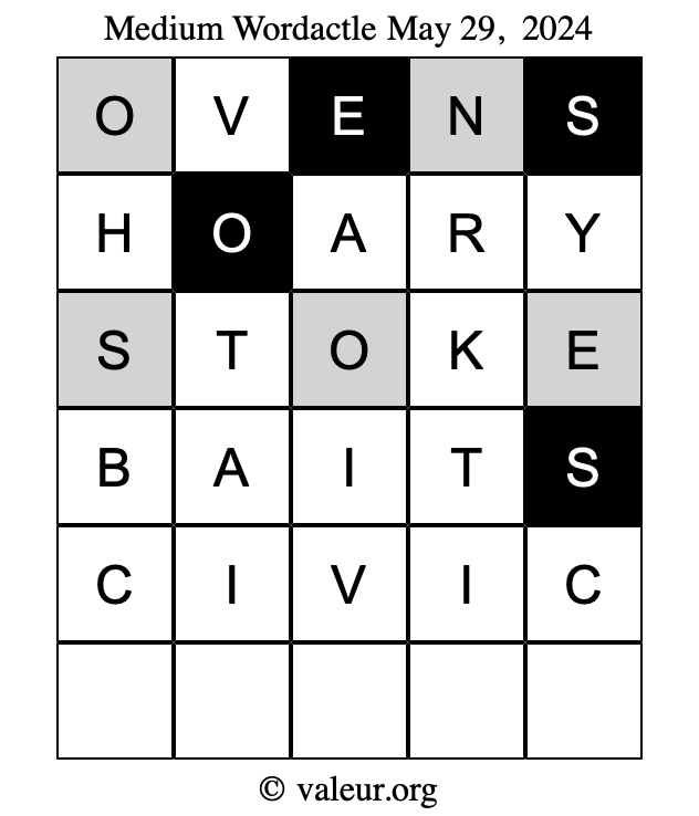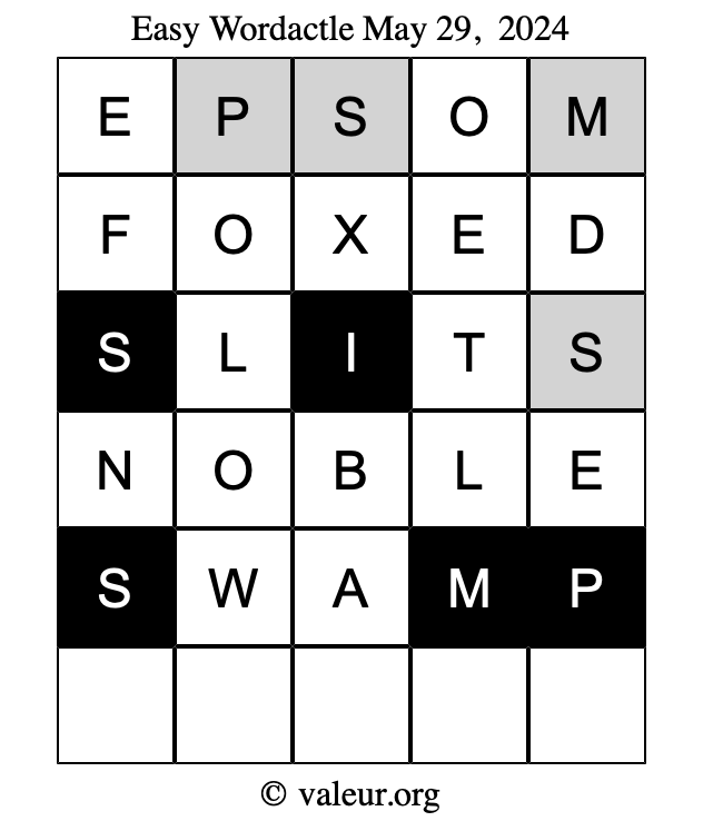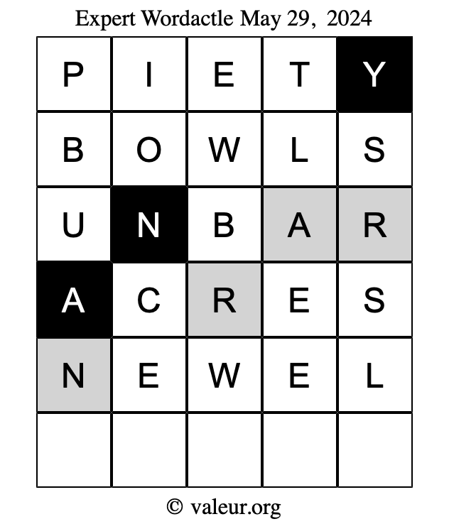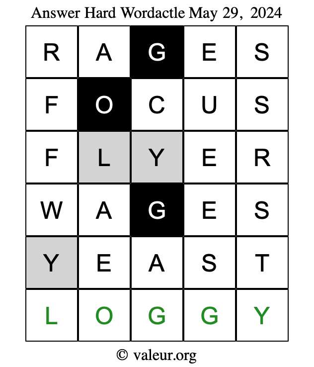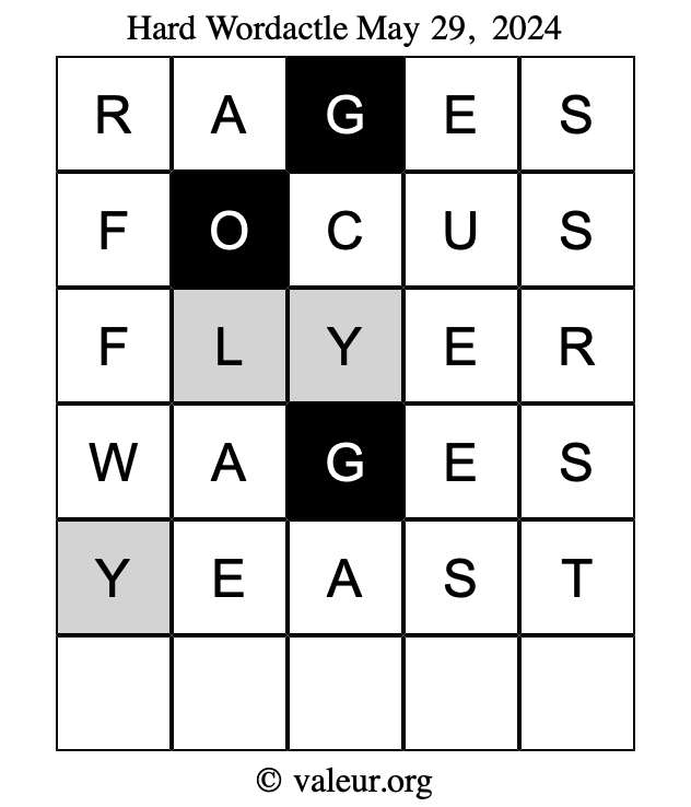Here are the May 29, 2024 daily four Wordactle puzzles. You are welcome to print a copy of the puzzles and solve them by hand. For your convenience, we have also included the solutions further down the page so you can check your work.