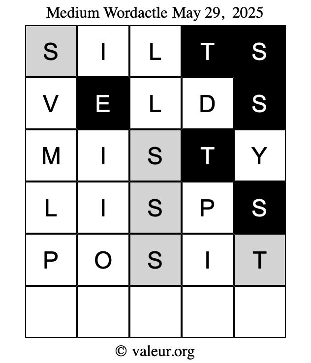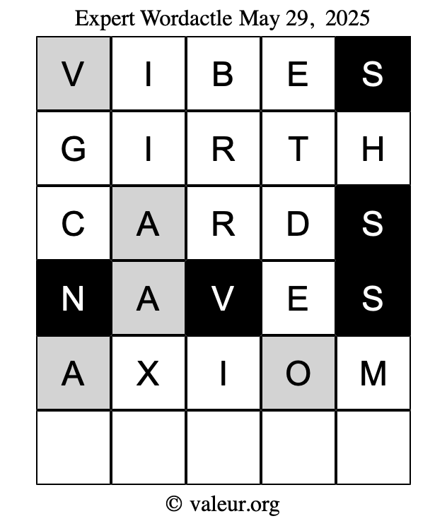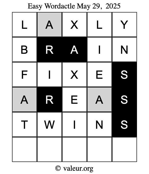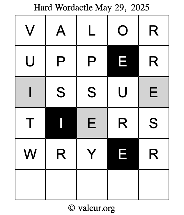Here are the May 29, 2025 daily four Wordactle puzzles. You are welcome to print a copy of the puzzles and solve them by hand. For your convenience, we have also included the solutions further down the page so you can check your work.