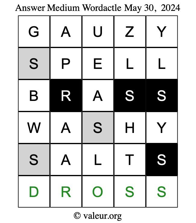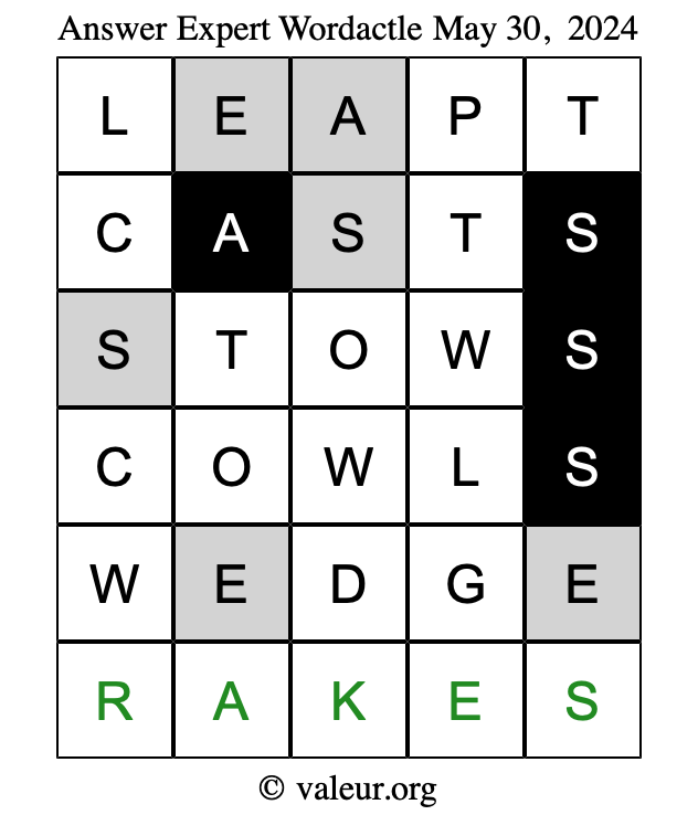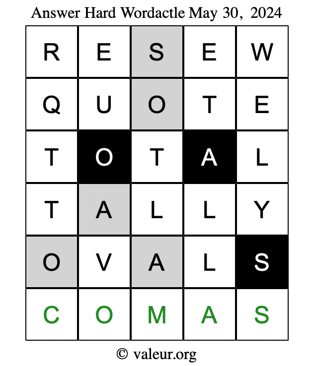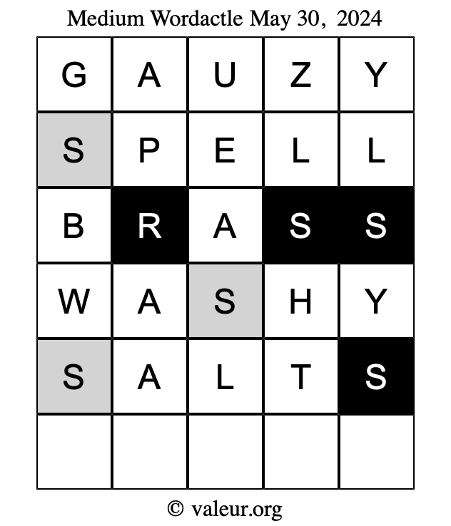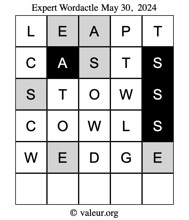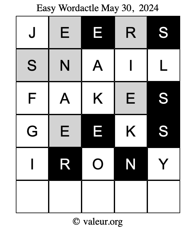 Here are the May 30, 2024 daily four Wordactle puzzles. You are welcome to print a copy of the puzzles and solve them by hand. For your convenience, we have also included the solutions further down the page so you can check your work.
