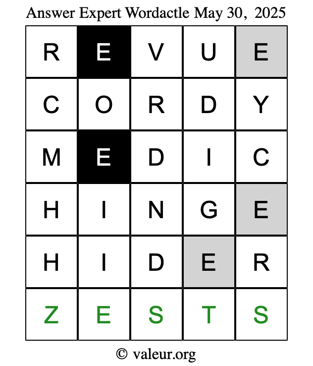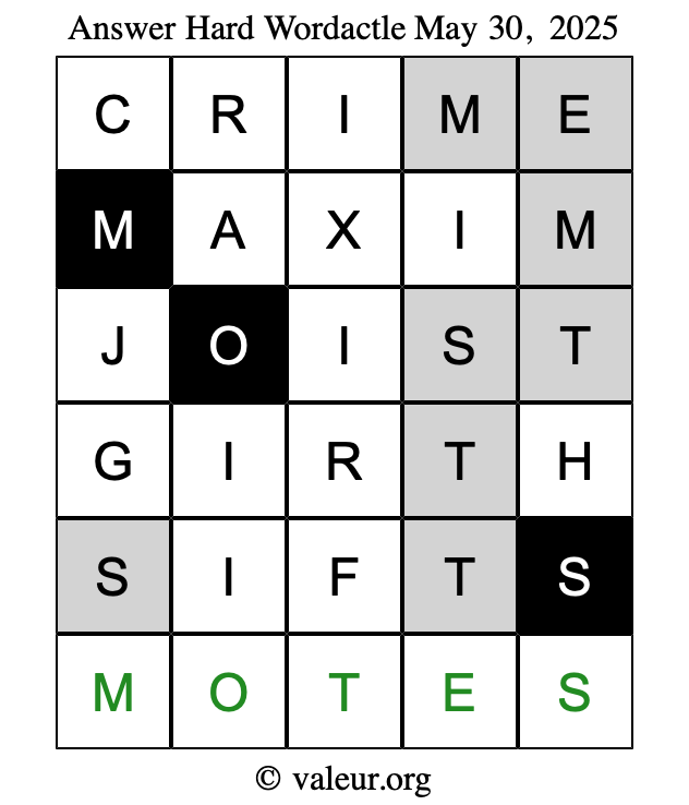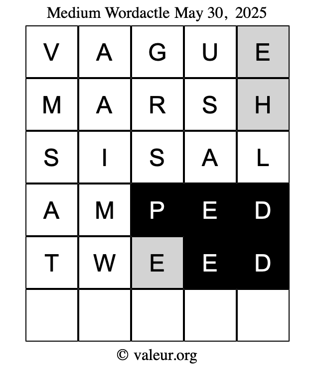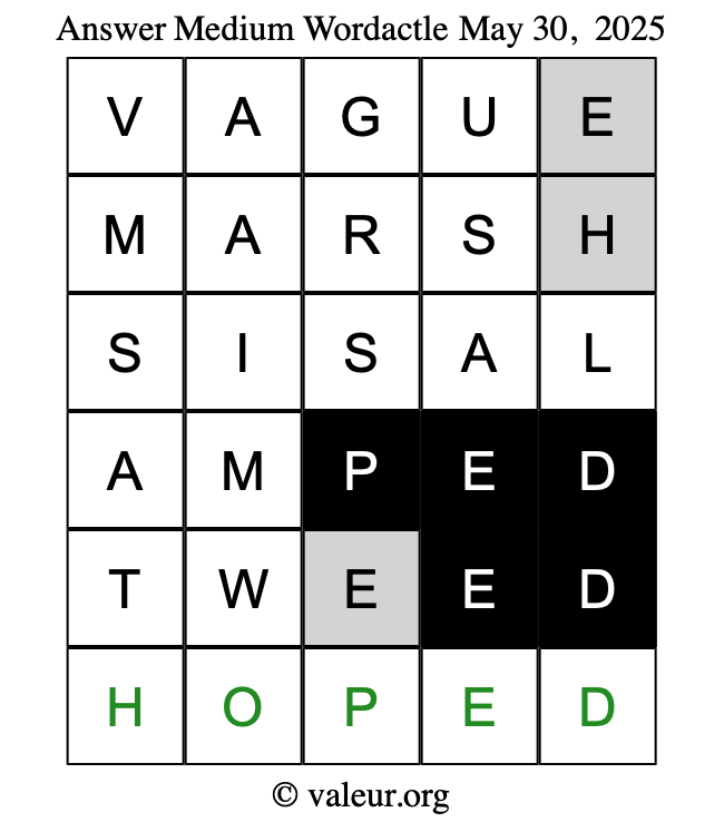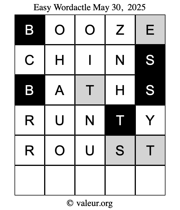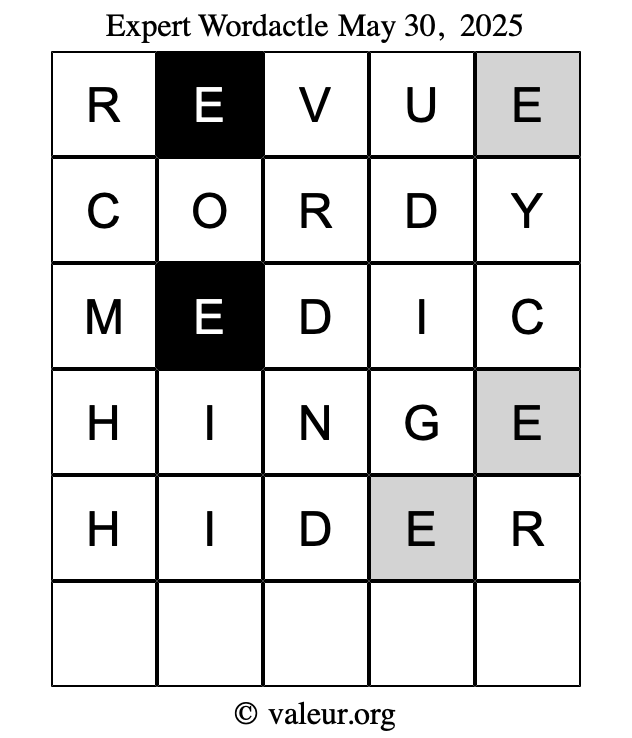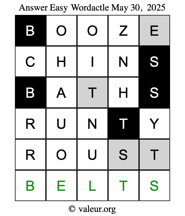 Here are the May 30, 2025 daily four Wordactle puzzles. You are welcome to print a copy of the puzzles and solve them by hand. For your convenience, we have also included the solutions further down the page so you can check your work.