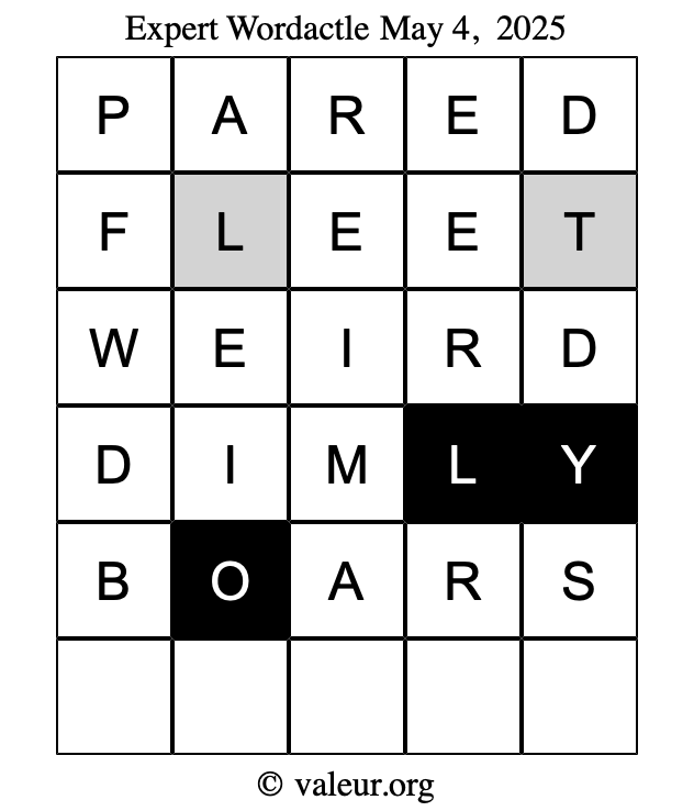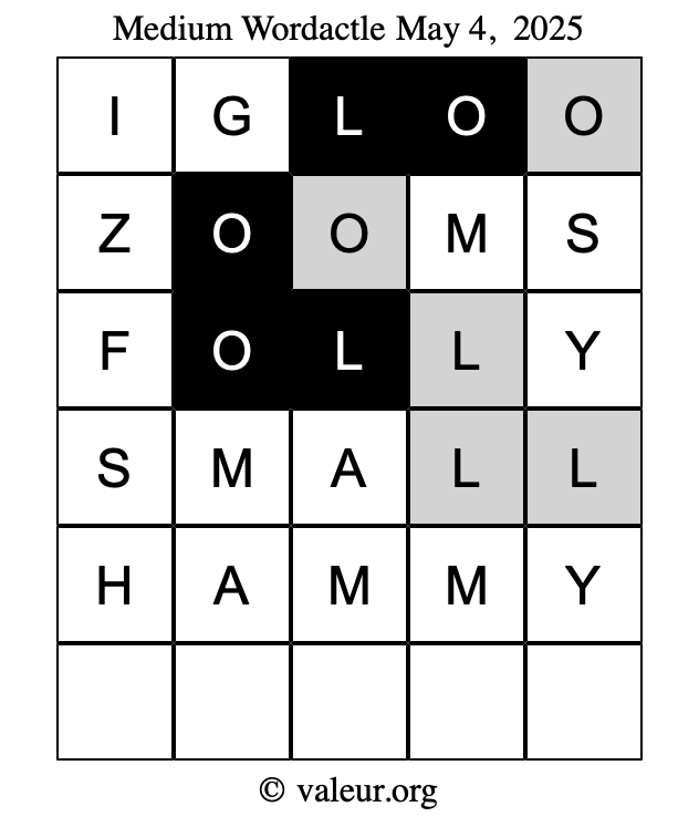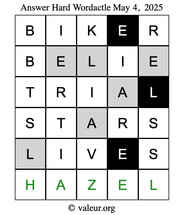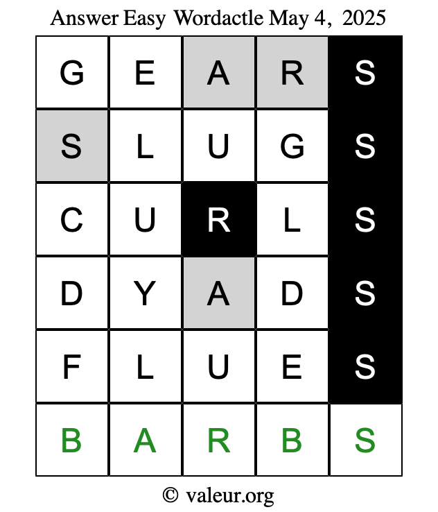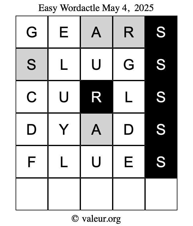 Here are the May 4, 2025 daily four Wordactle puzzles. You are welcome to print a copy of the puzzles and solve them by hand. For your convenience, we have also included the solutions further down the page so you can check your work.