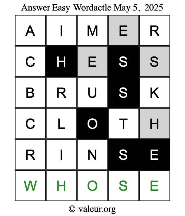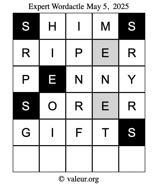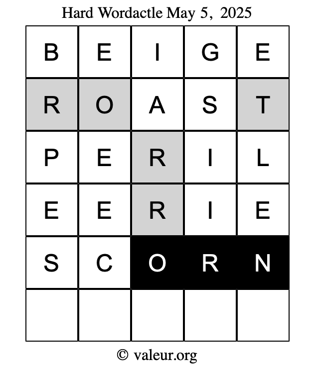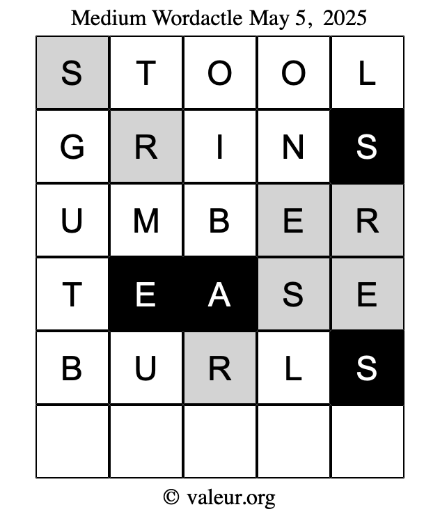 Here are the May 5, 2025 daily four Wordactle puzzles. You are welcome to print a copy of the puzzles and solve them by hand. For your convenience, we have also included the solutions further down the page so you can check your work.