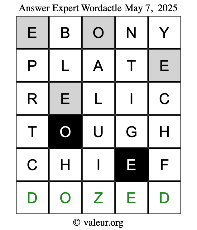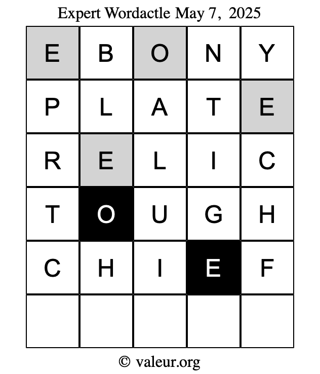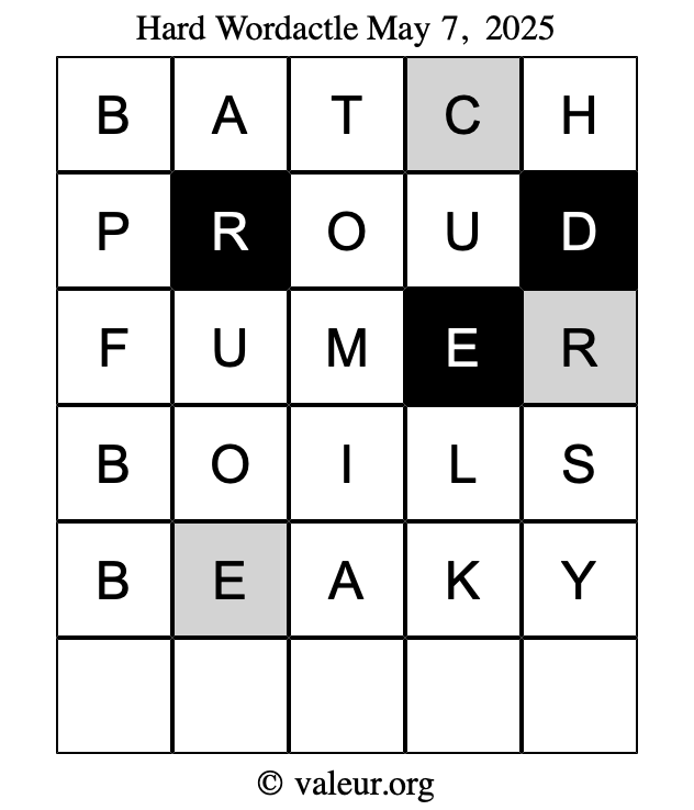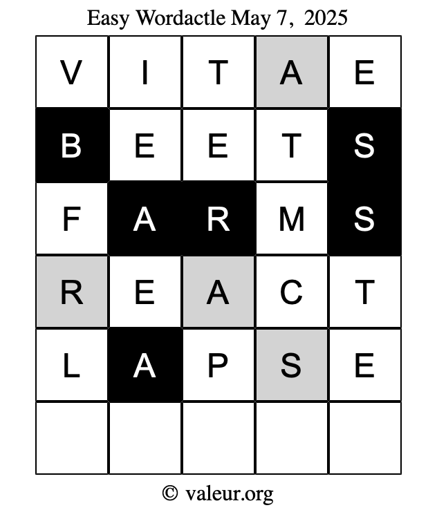Here are the May 7, 2025 daily four Wordactle puzzles. You are welcome to print a copy of the puzzles and solve them by hand. For your convenience, we have also included the solutions further down the page so you can check your work.
