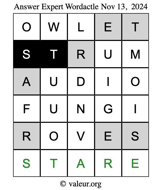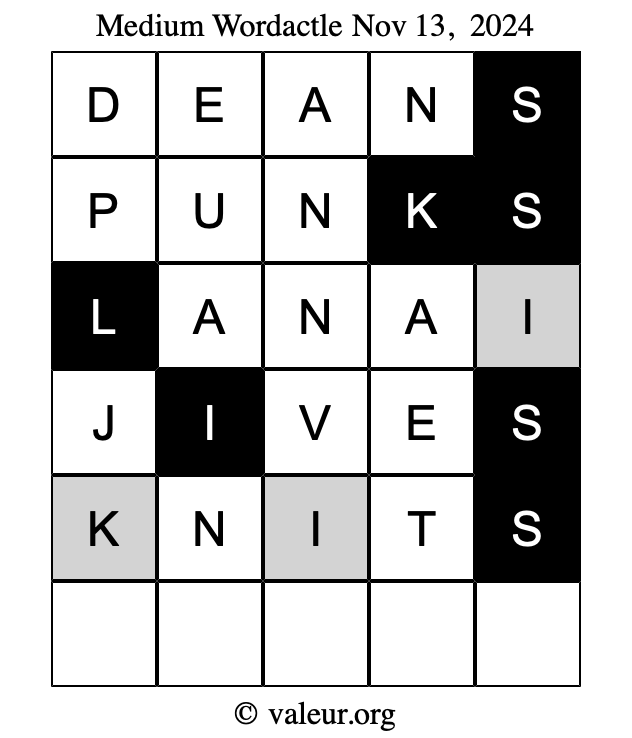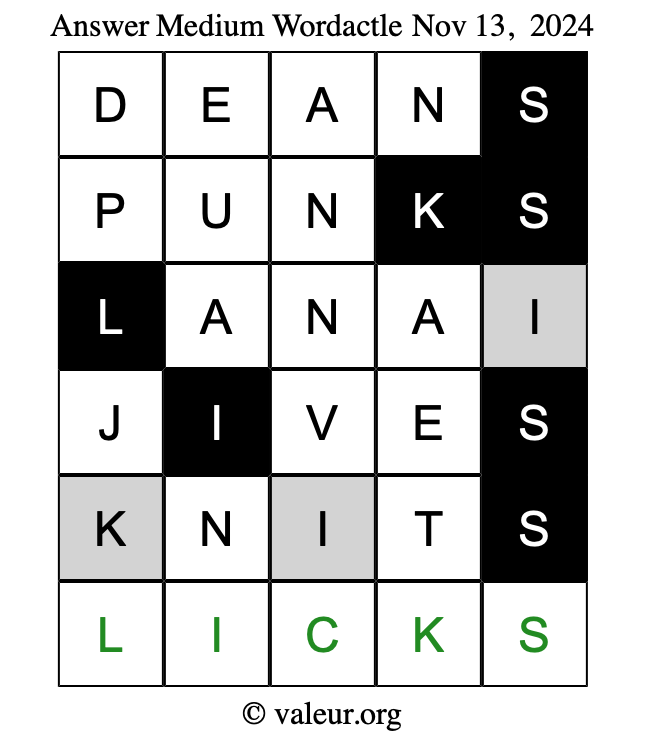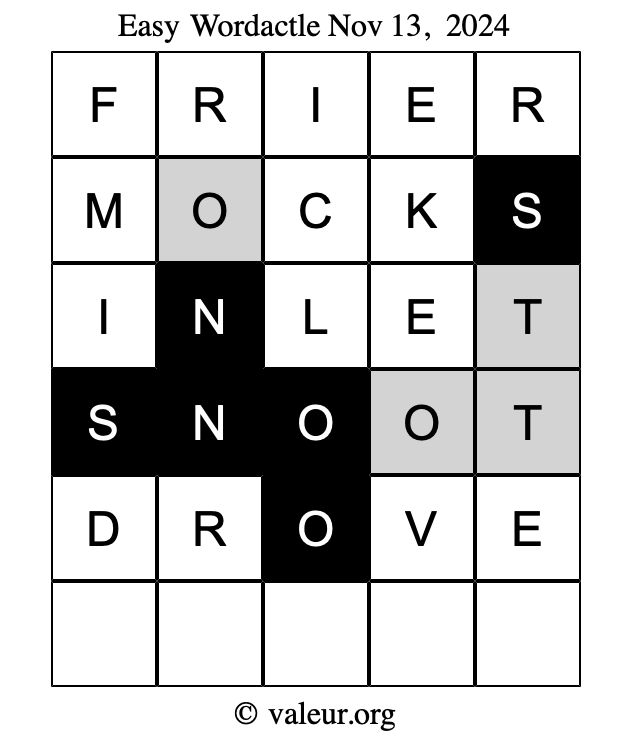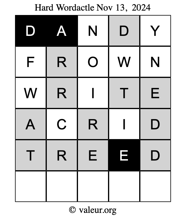Here are the November 13, 2024 daily four Wordactle puzzles. You are welcome to print a copy of the puzzles and solve them by hand. For your convenience, we have also included the solutions further down the page so you can check your work.