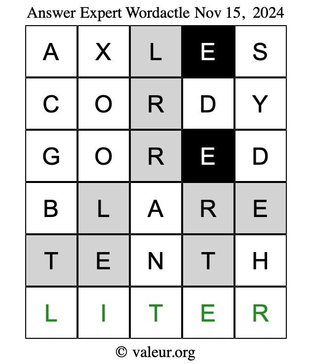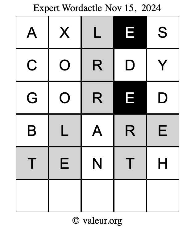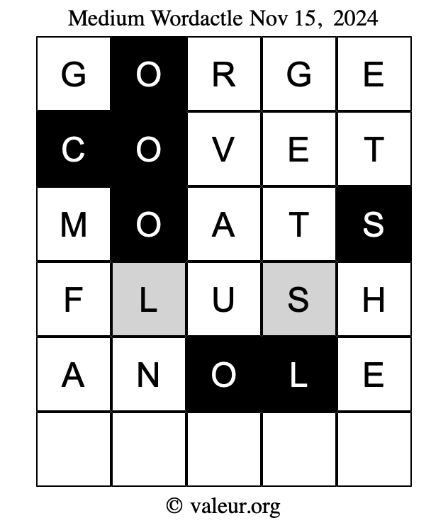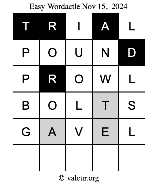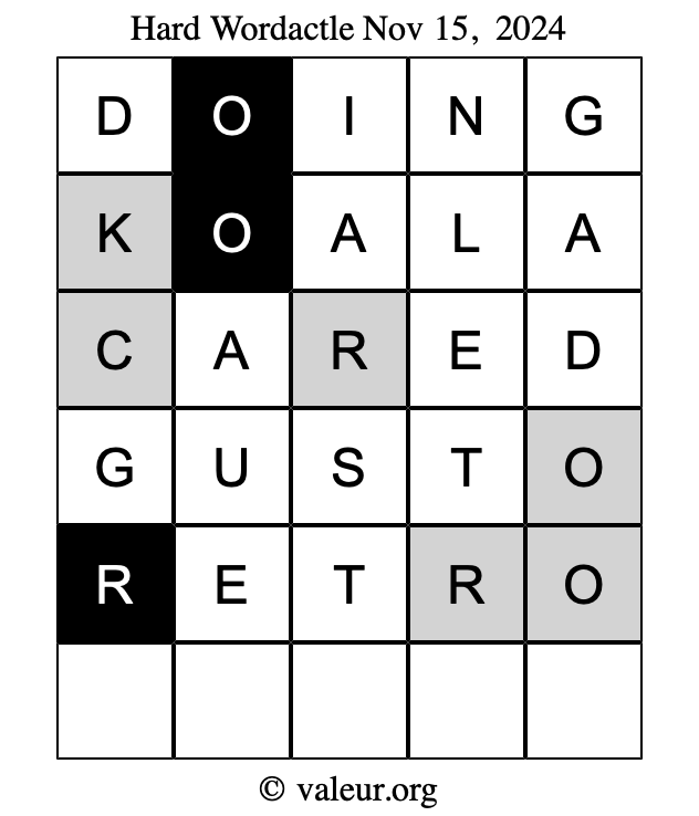 Here are the November 15, 2024 daily four Wordactle puzzles. You are welcome to print a copy of the puzzles and solve them by hand. For your convenience, we have also included the solutions further down the page so you can check your work.