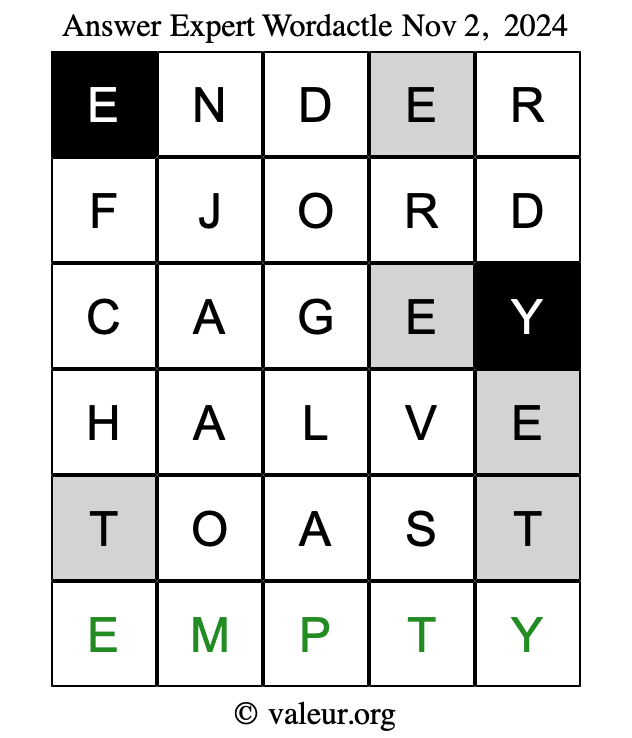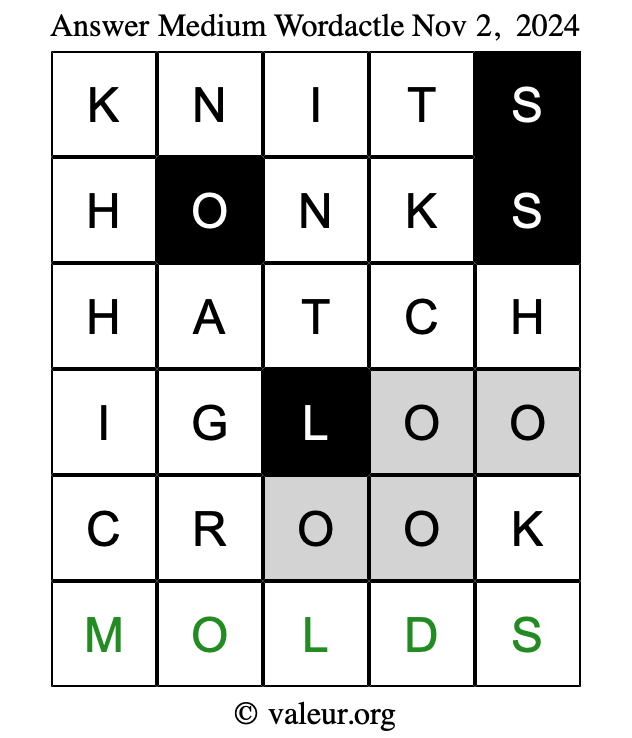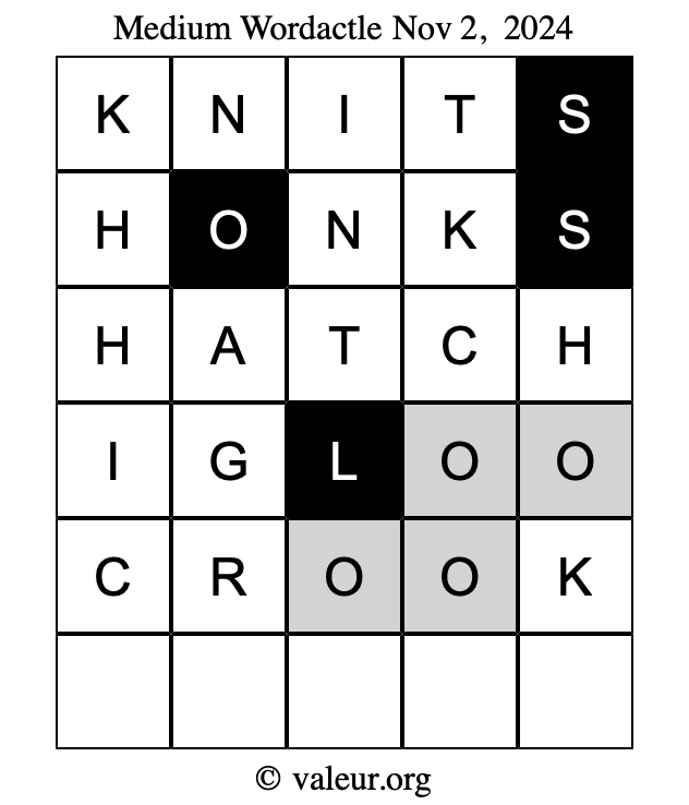 Here are the November 2, 2024 daily four Wordactle puzzles. You are welcome to print a copy of the puzzles and solve them by hand. For your convenience, we have also included the solutions further down the page so you can check your work.