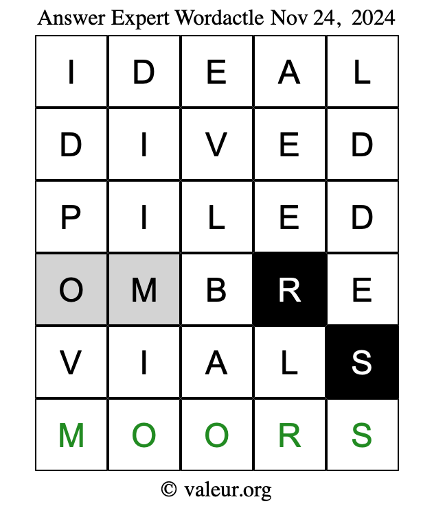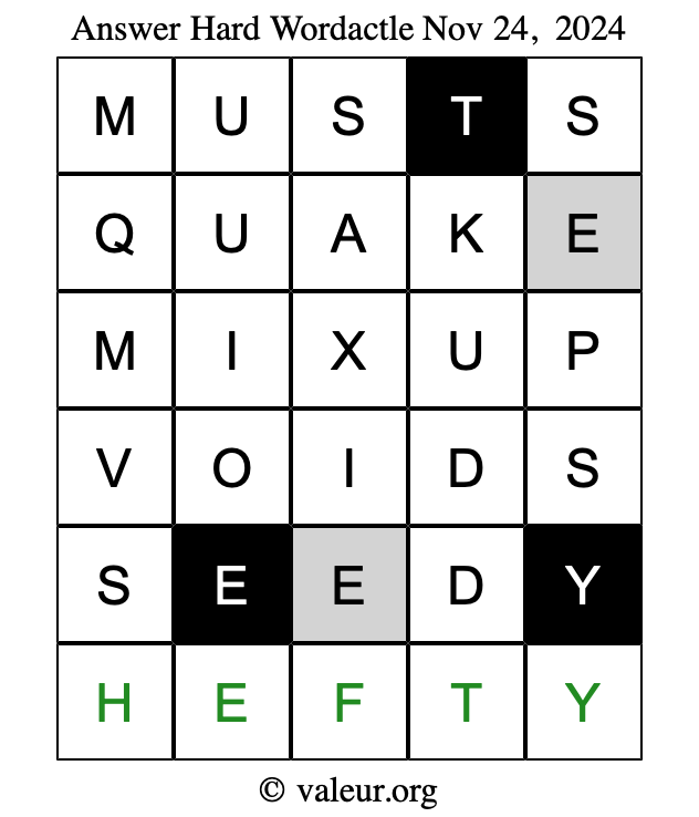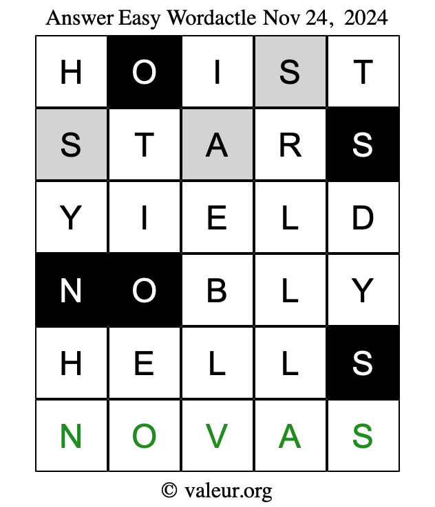 Here are the November 24, 2024 daily four Wordactle puzzles. You are welcome to print a copy of the puzzles and solve them by hand. For your convenience, we have also included the solutions further down the page so you can check your work.