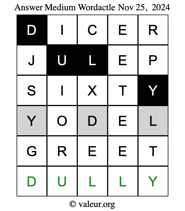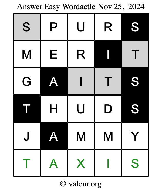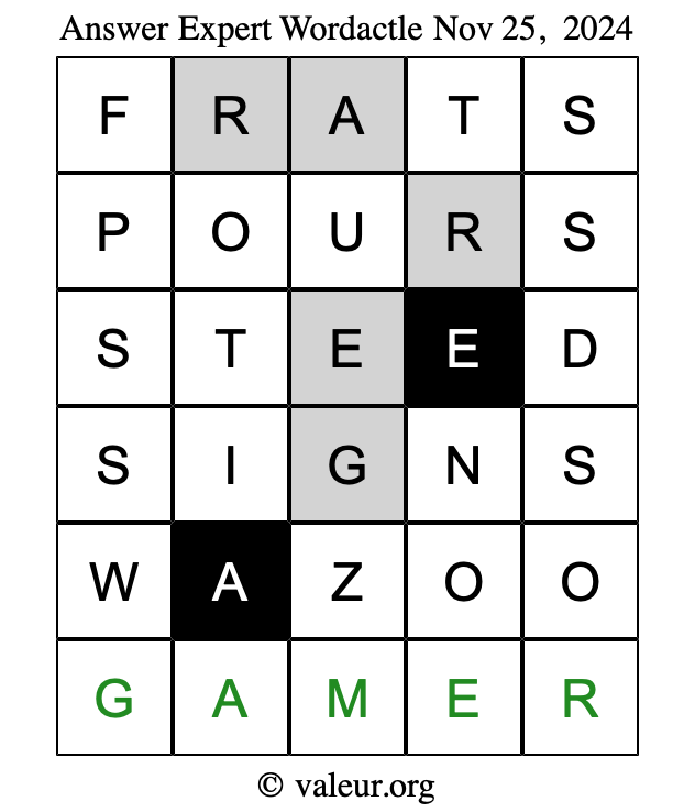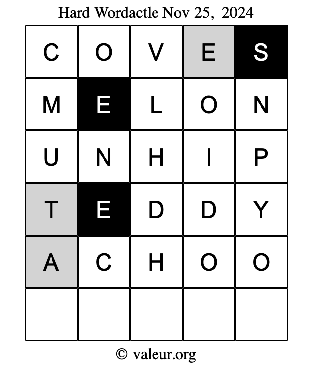 Here are the November 25, 2024 daily four Wordactle puzzles. You are welcome to print a copy of the puzzles and solve them by hand. For your convenience, we have also included the solutions further down the page so you can check your work.