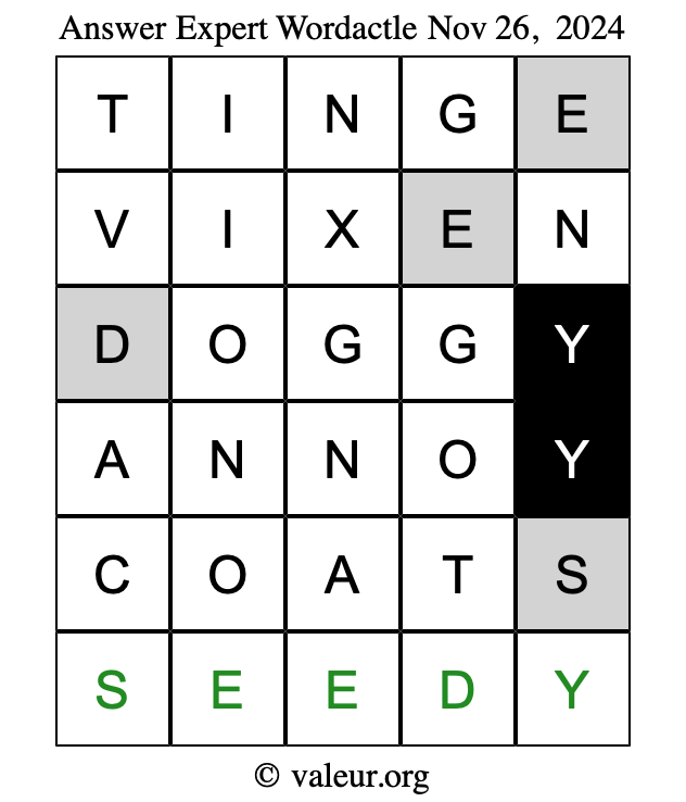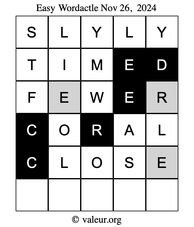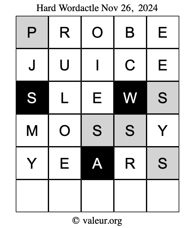 Here are the November 26, 2024 daily four Wordactle puzzles. You are welcome to print a copy of the puzzles and solve them by hand. For your convenience, we have also included the solutions further down the page so you can check your work.