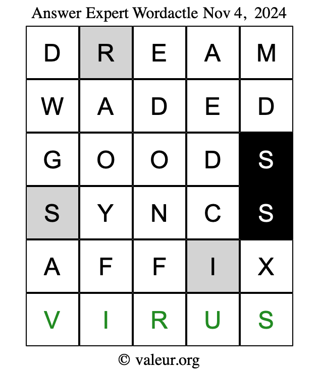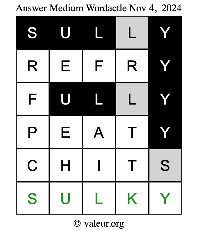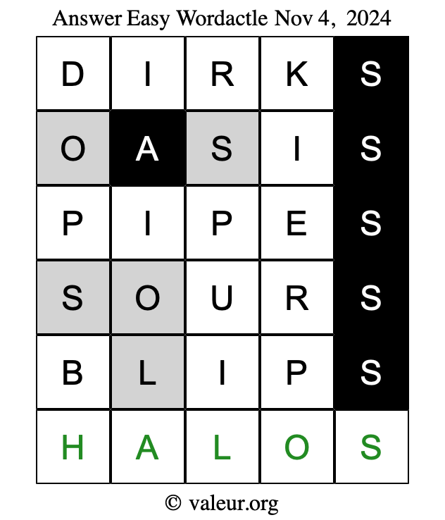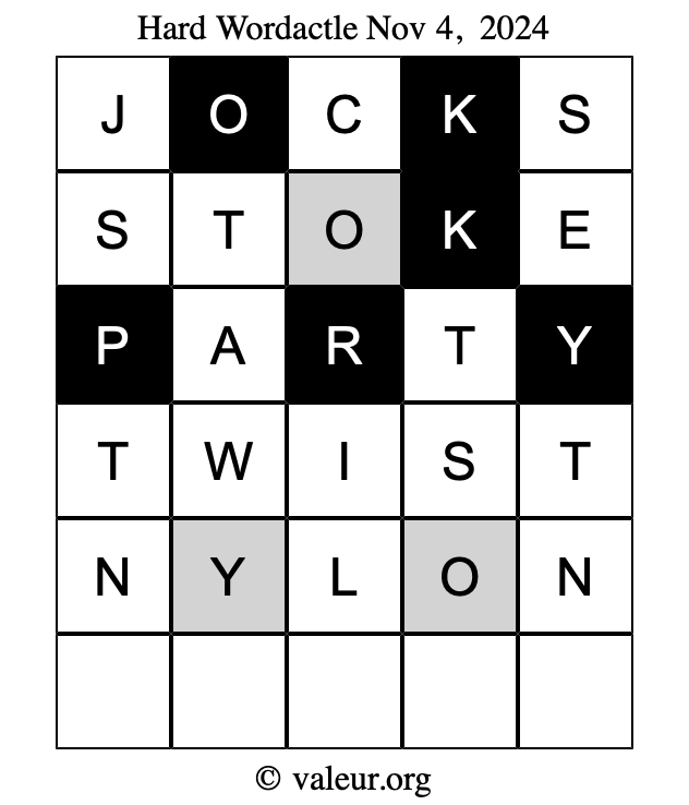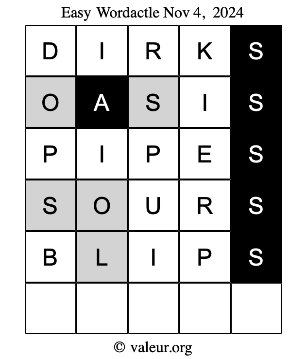 Here are the November 4, 2024 daily four Wordactle puzzles. You are welcome to print a copy of the puzzles and solve them by hand. For your convenience, we have also included the solutions further down the page so you can check your work.