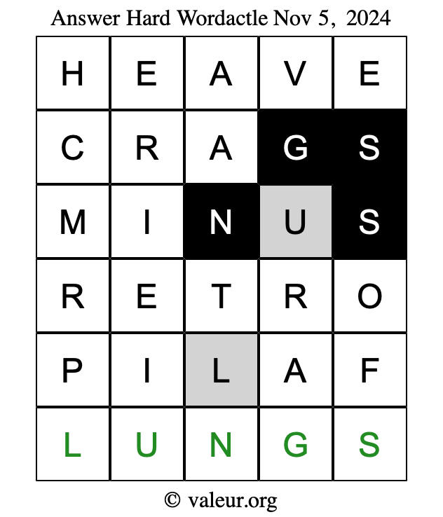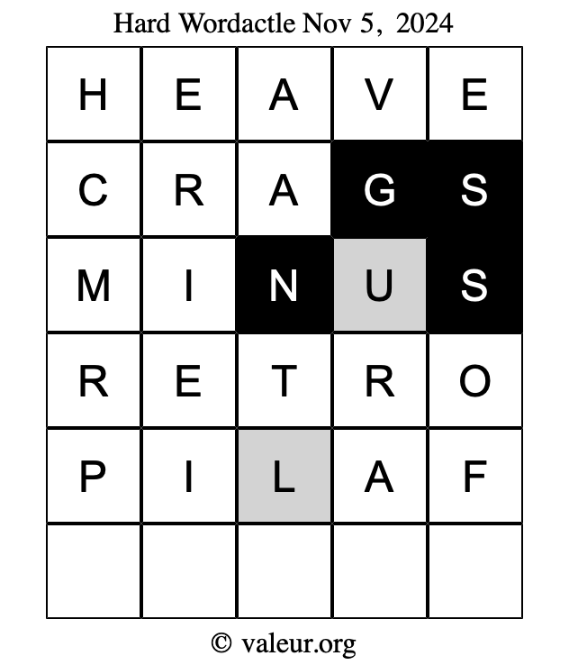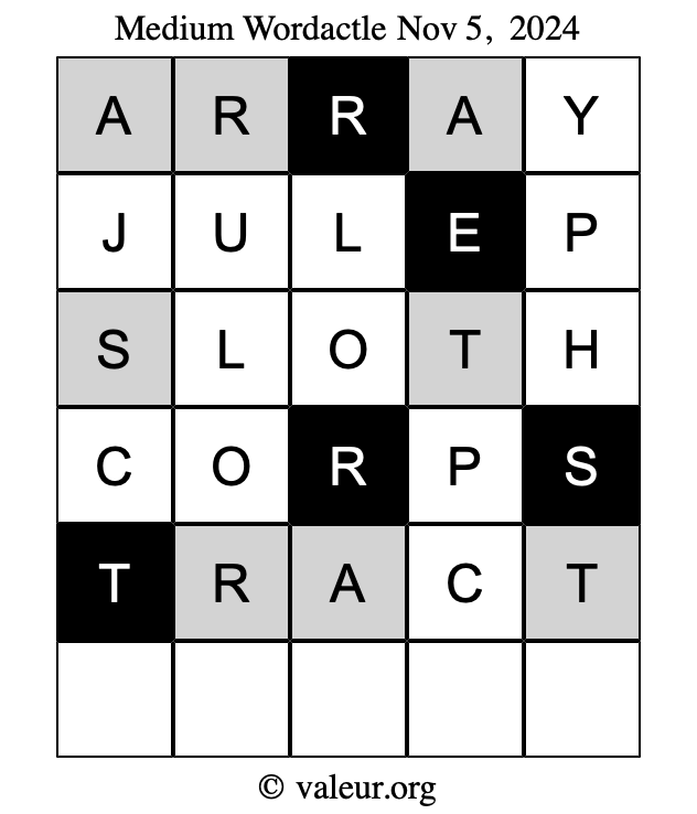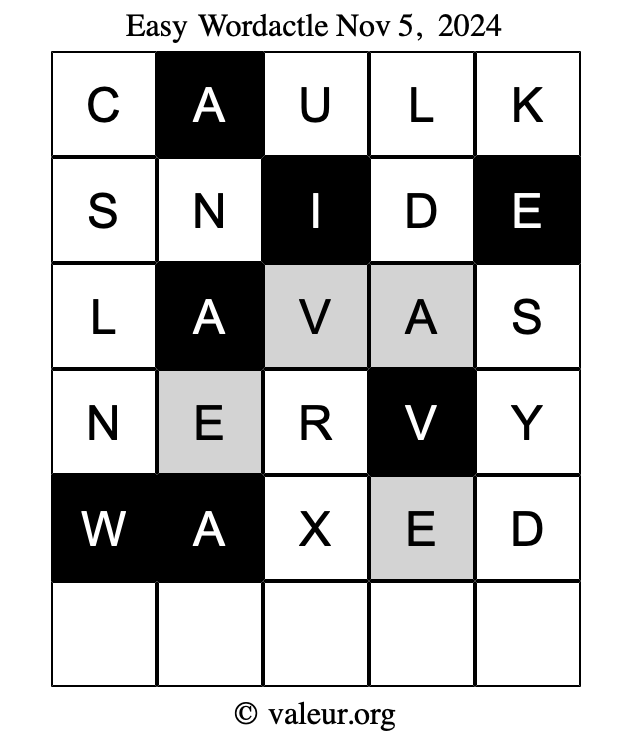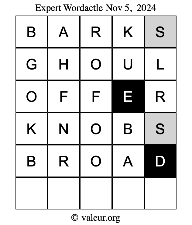 Here are the November 5, 2024 daily four Wordactle puzzles. You are welcome to print a copy of the puzzles and solve them by hand. For your convenience, we have also included the solutions further down the page so you can check your work.