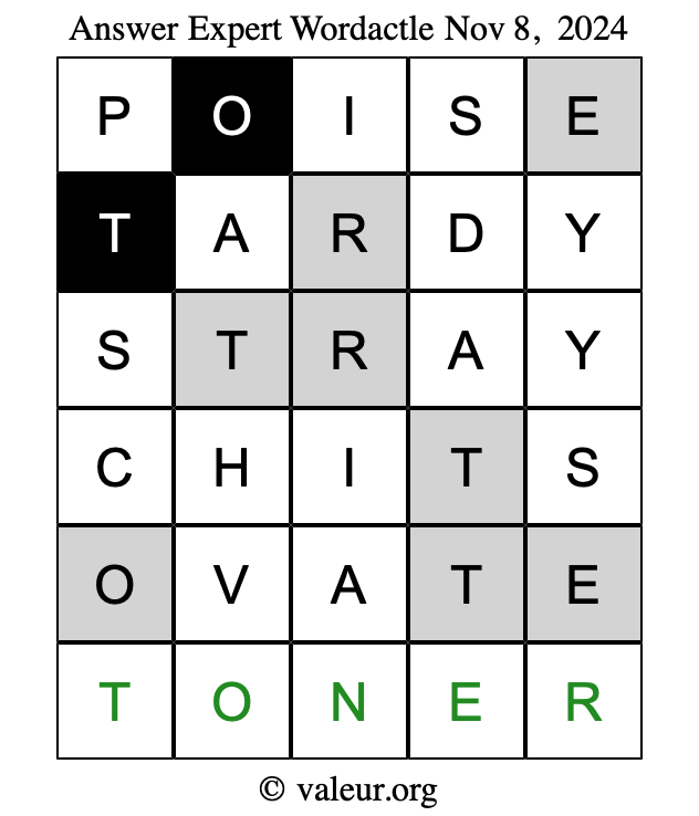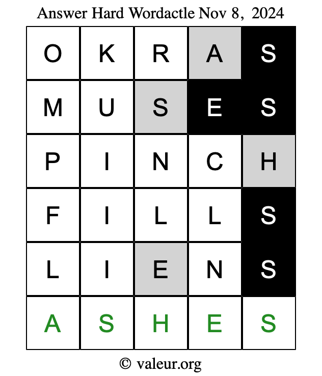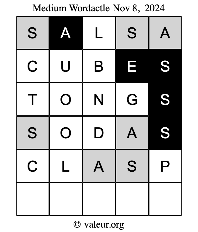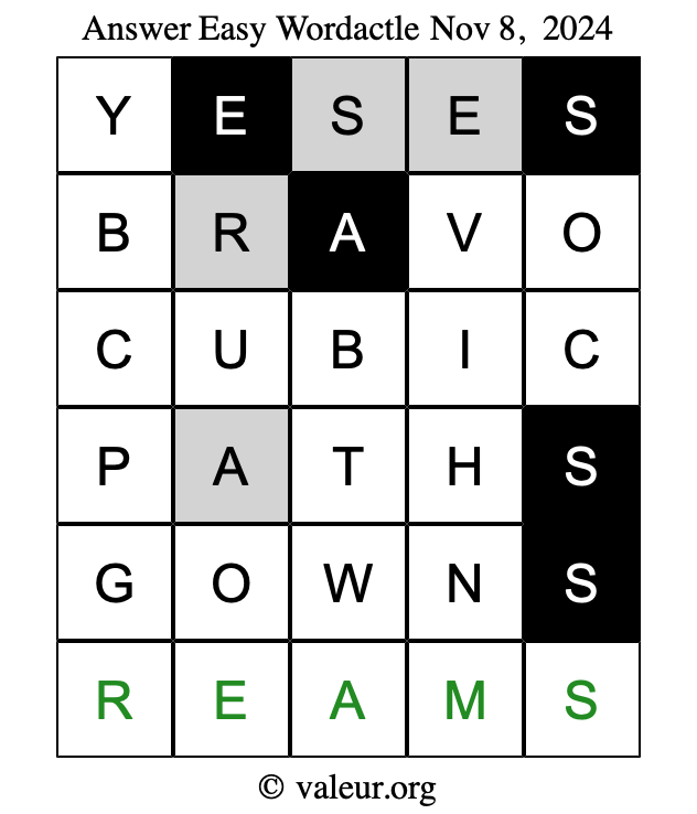 Here are the November 8, 2024 daily four Wordactle puzzles. You are welcome to print a copy of the puzzles and solve them by hand. For your convenience, we have also included the solutions further down the page so you can check your work.