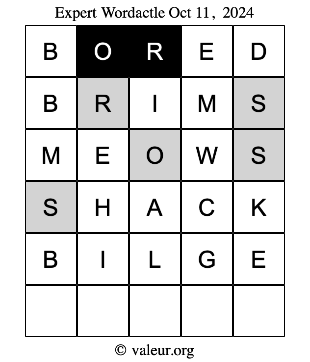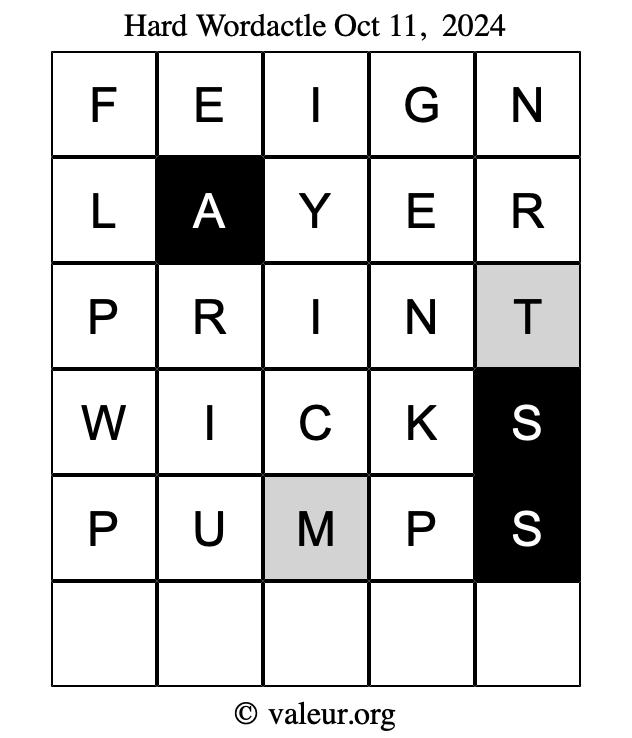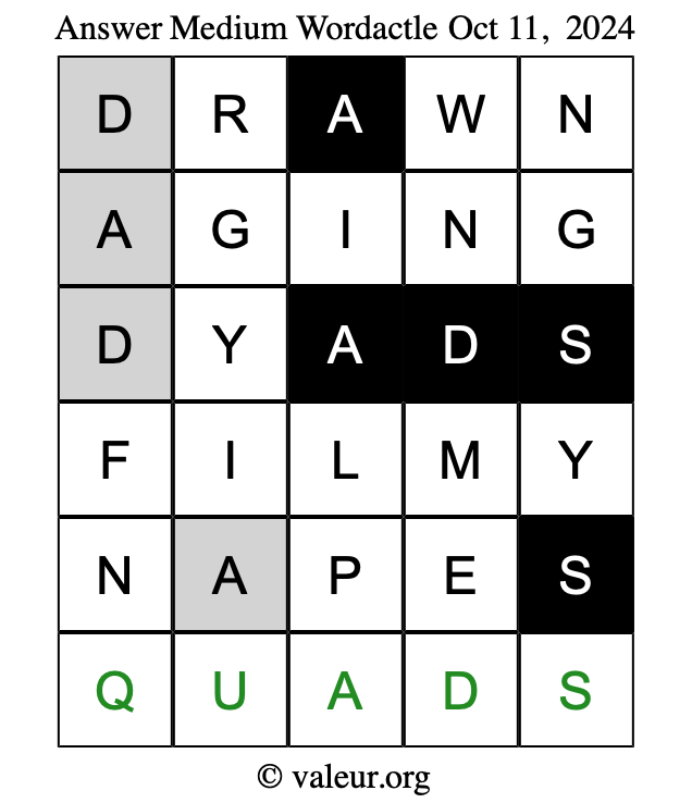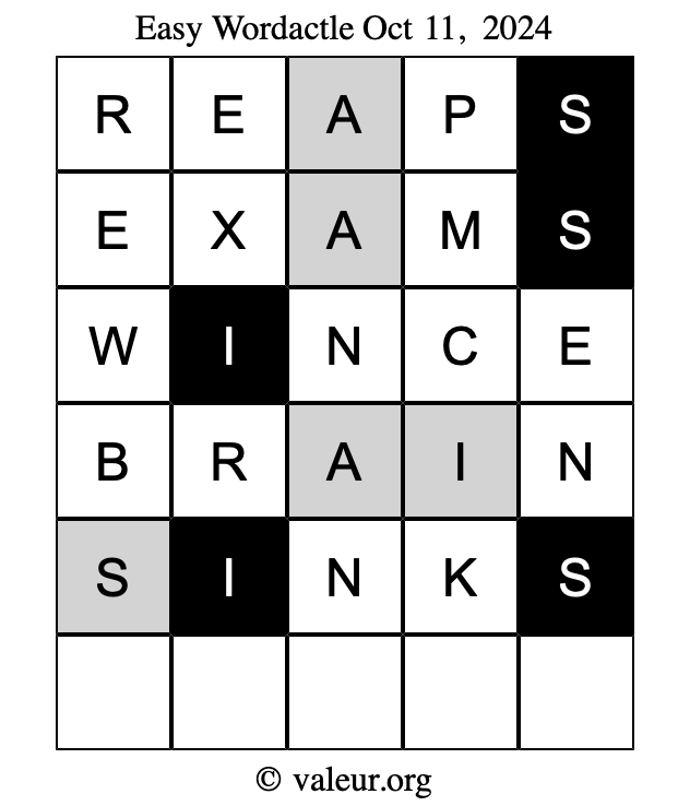 Here are the October 11, 2024 daily four Wordactle puzzles. You are welcome to print a copy of the puzzles and solve them by hand. For your convenience, we have also included the solutions further down the page so you can check your work.