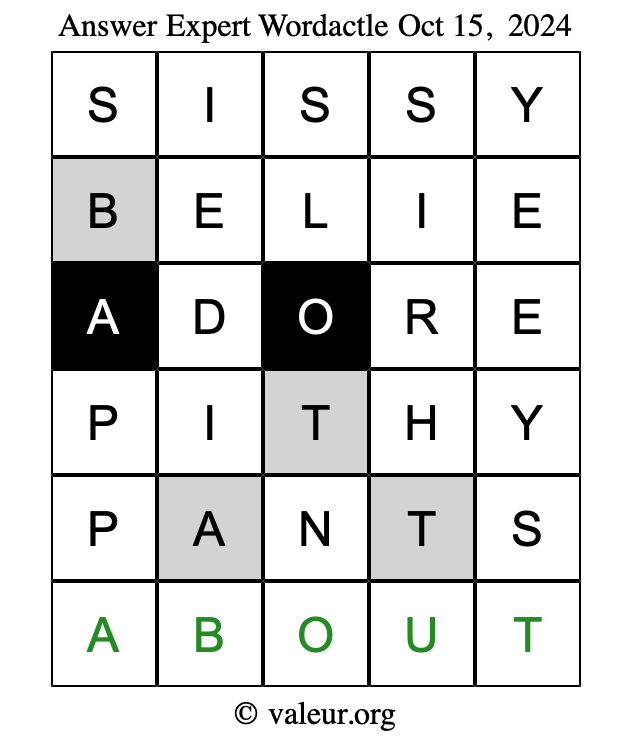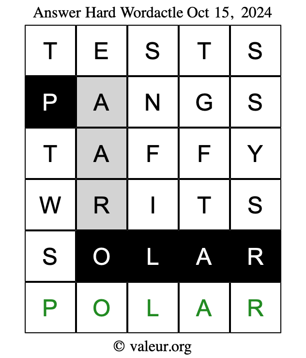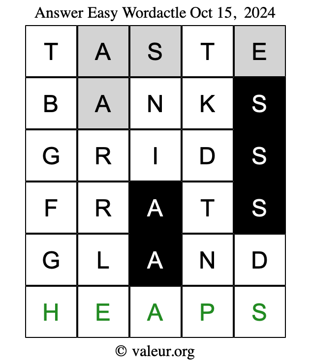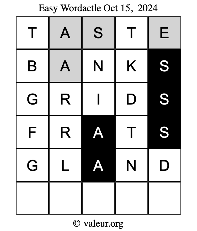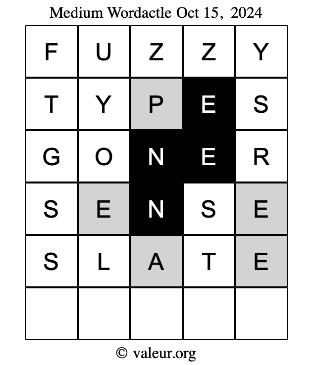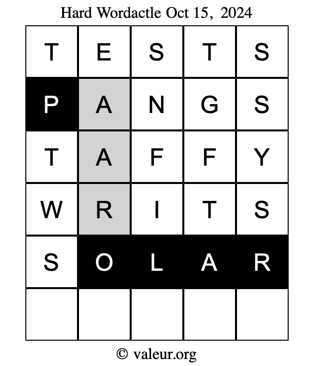 Here are the October 15, 2024 daily four Wordactle puzzles. You are welcome to print a copy of the puzzles and solve them by hand. For your convenience, we have also included the solutions further down the page so you can check your work.