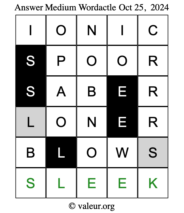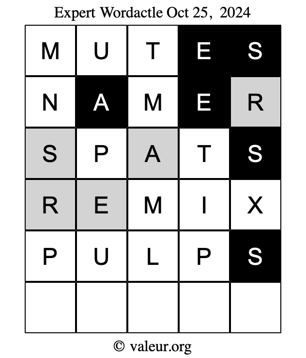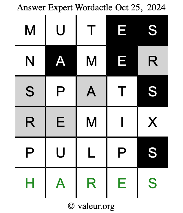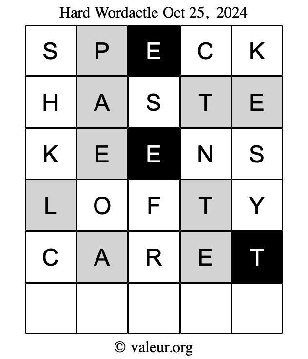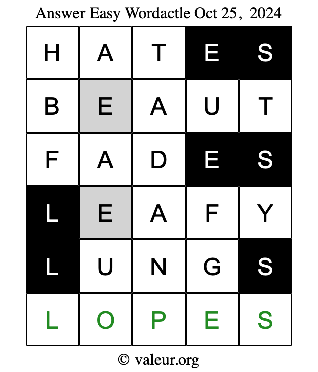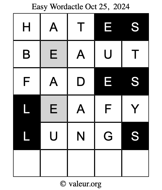 Here are the October 25, 2024 daily four Wordactle puzzles. You are welcome to print a copy of the puzzles and solve them by hand. For your convenience, we have also included the solutions further down the page so you can check your work.