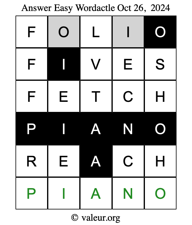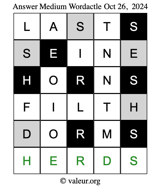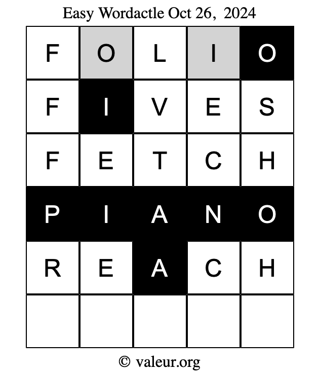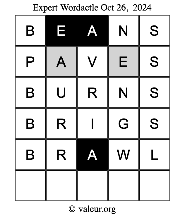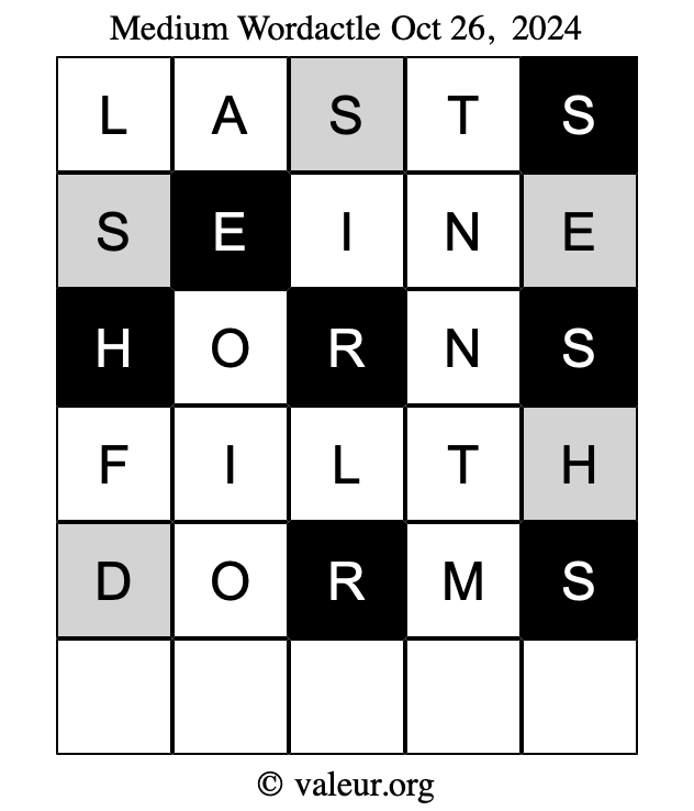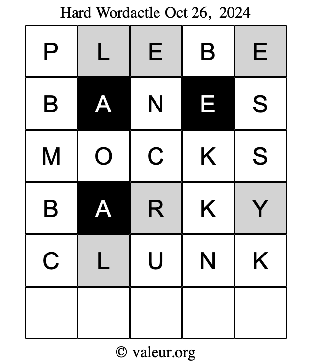 Here are the October 26, 2024 daily four Wordactle puzzles. You are welcome to print a copy of the puzzles and solve them by hand. For your convenience, we have also included the solutions further down the page so you can check your work.