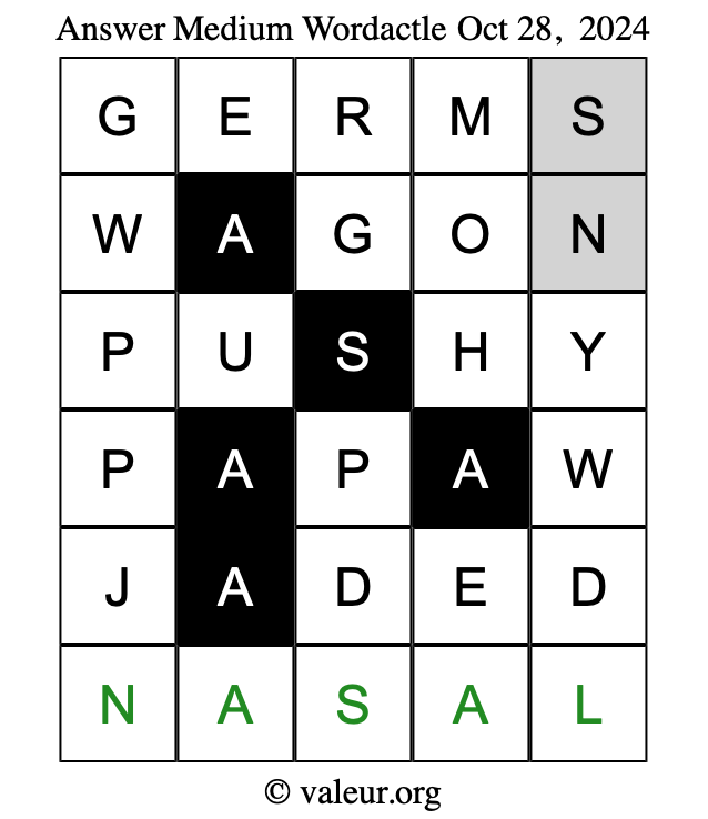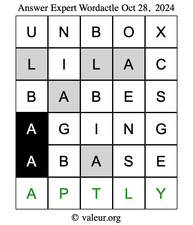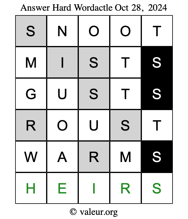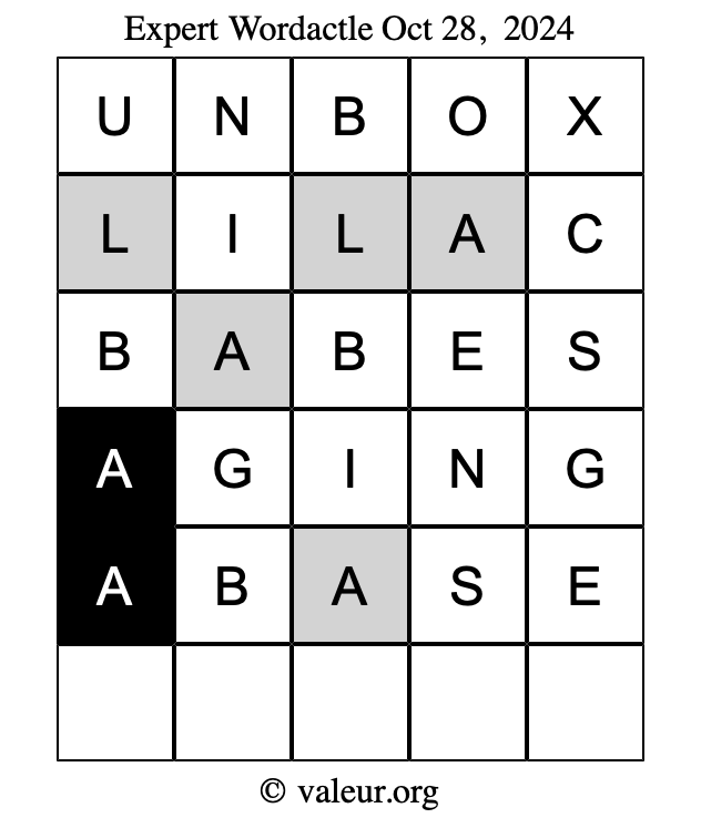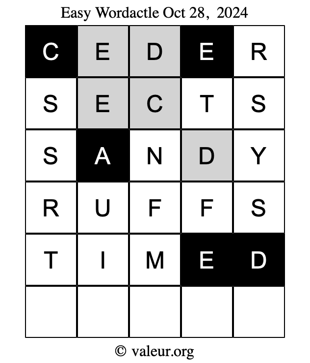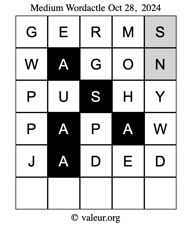 Here are the October 28, 2024 daily four Wordactle puzzles. You are welcome to print a copy of the puzzles and solve them by hand. For your convenience, we have also included the solutions further down the page so you can check your work.