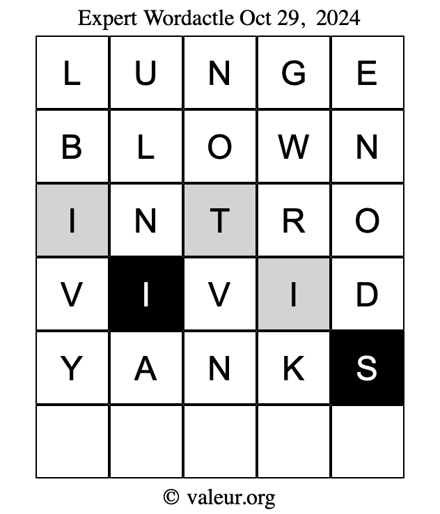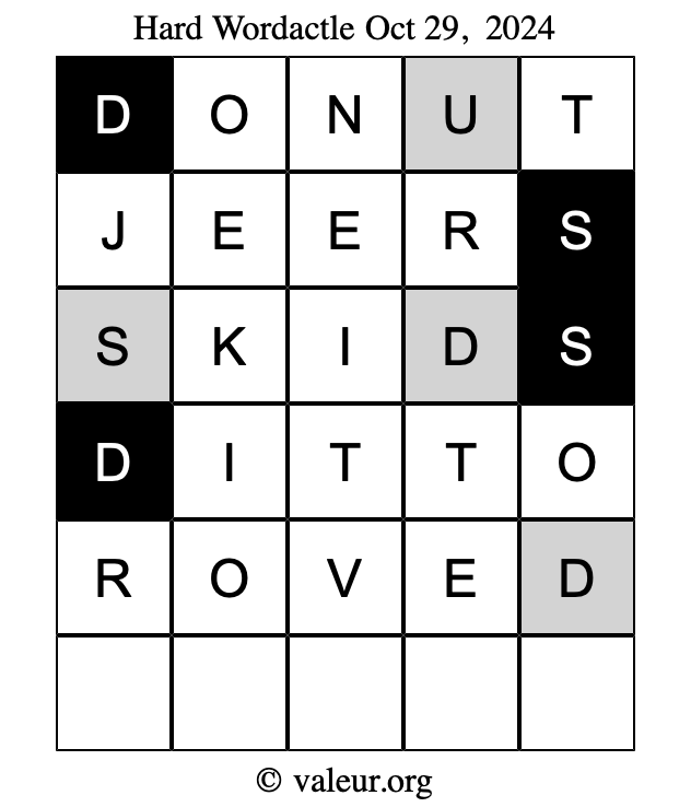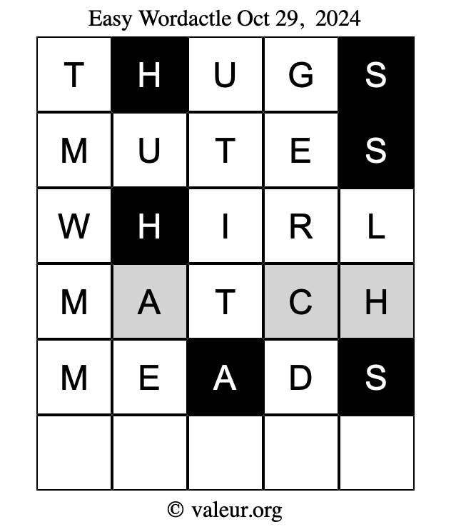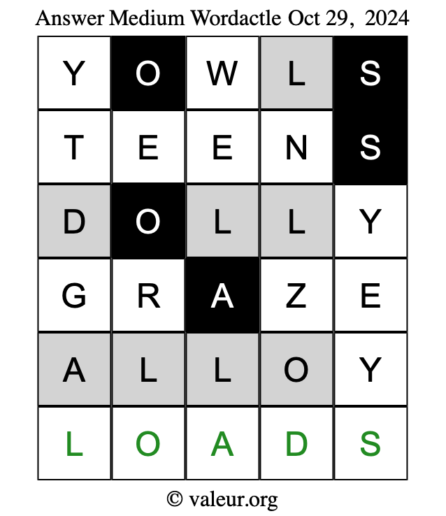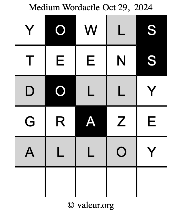 Here are the October 29, 2024 daily four Wordactle puzzles. You are welcome to print a copy of the puzzles and solve them by hand. For your convenience, we have also included the solutions further down the page so you can check your work.