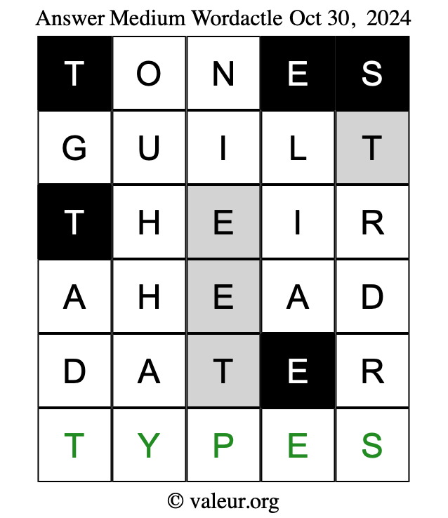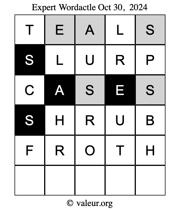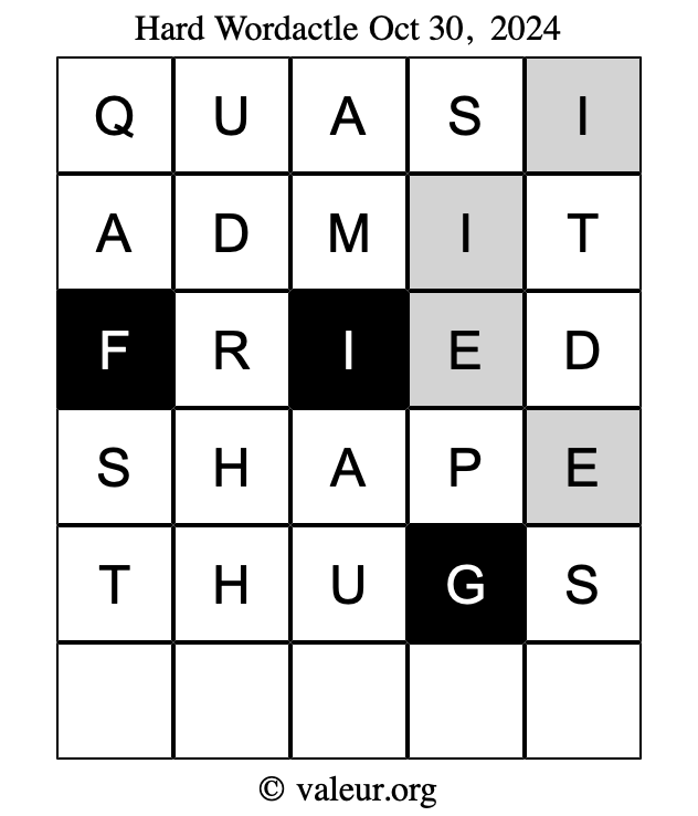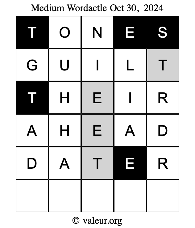 Here are the October 30, 2024 daily four Wordactle puzzles. You are welcome to print a copy of the puzzles and solve them by hand. For your convenience, we have also included the solutions further down the page so you can check your work.