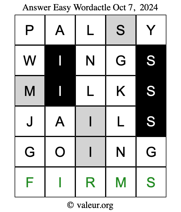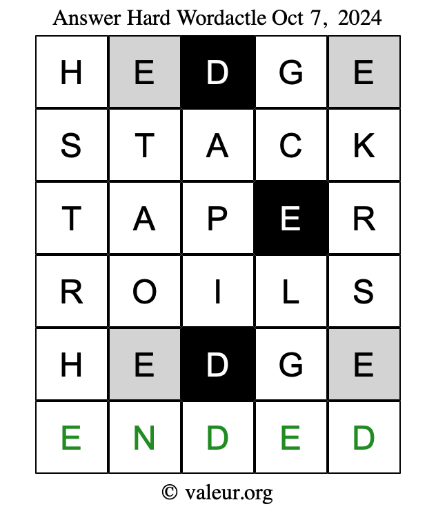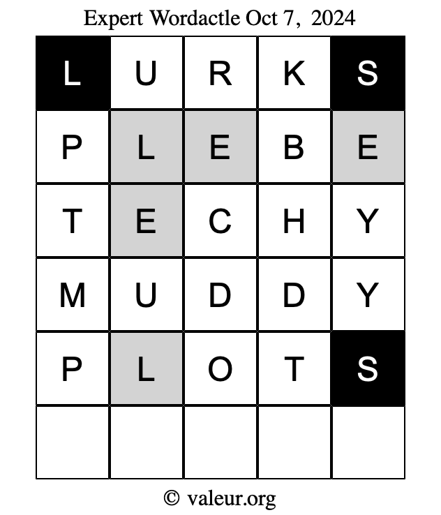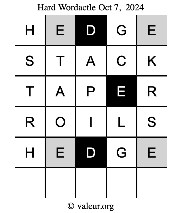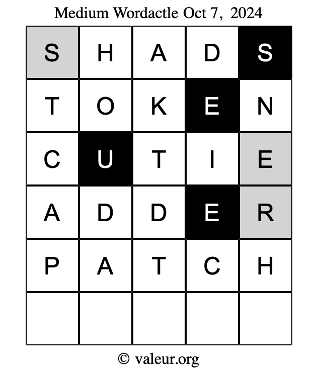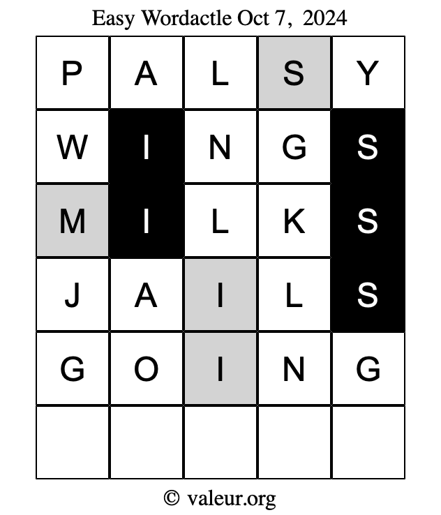 Here are the October 7, 2024 daily four Wordactle puzzles. You are welcome to print a copy of the puzzles and solve them by hand. For your convenience, we have also included the solutions further down the page so you can check your work.