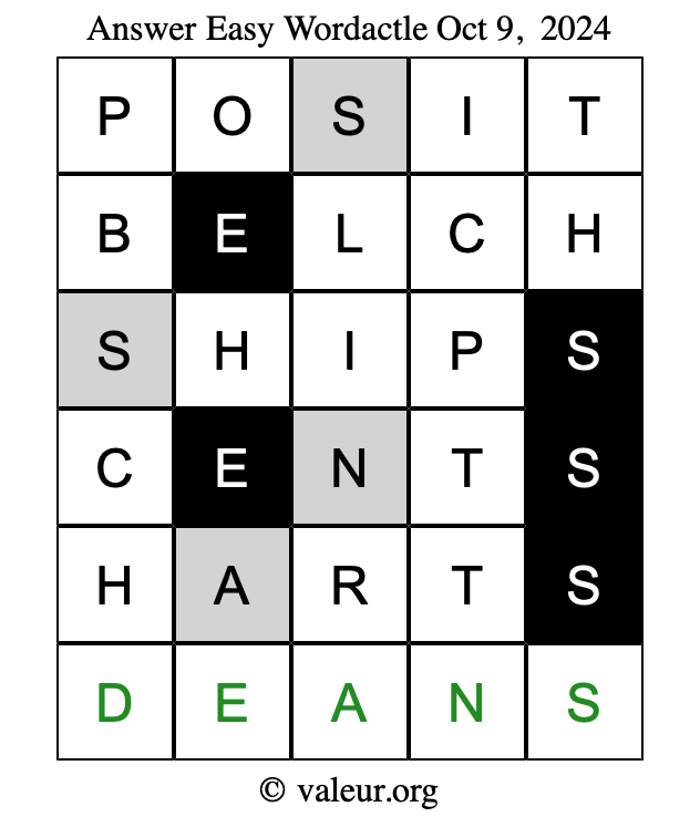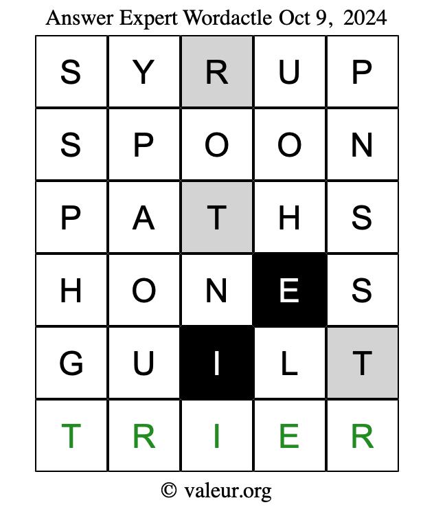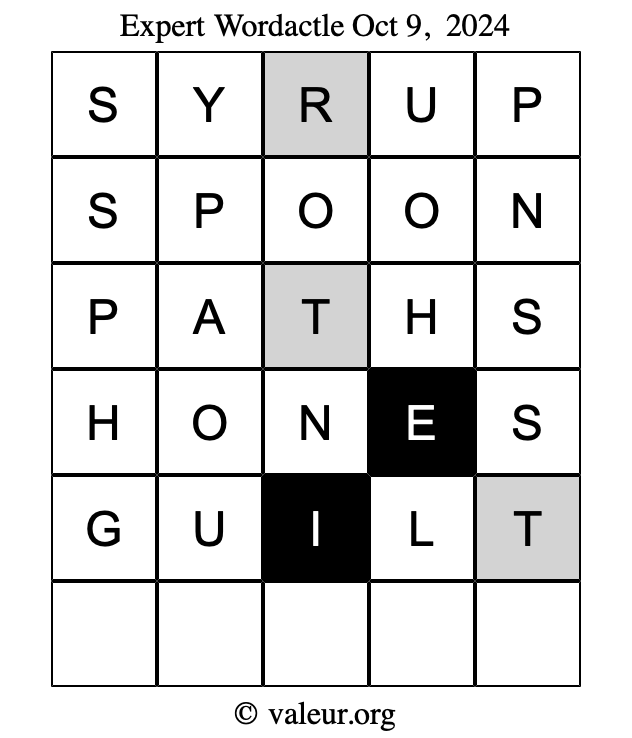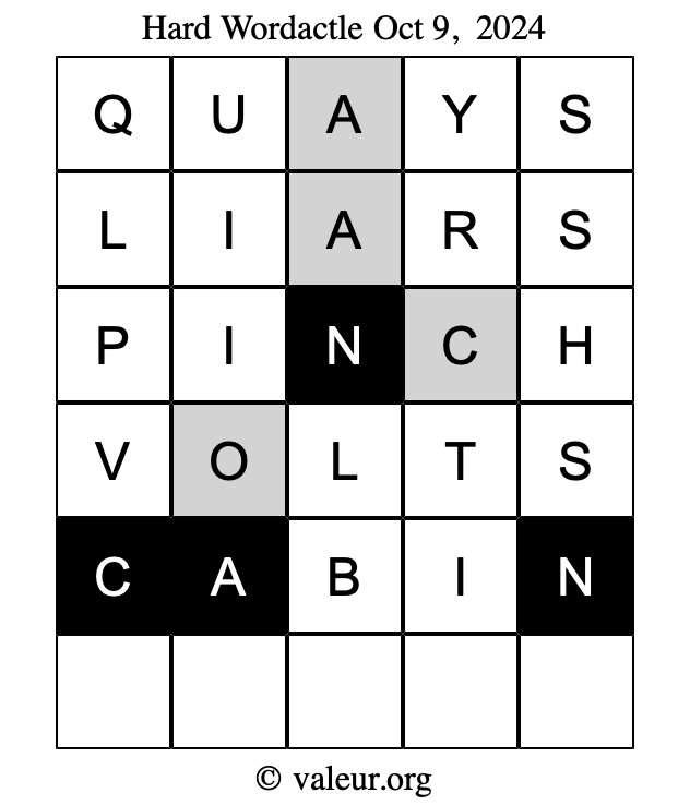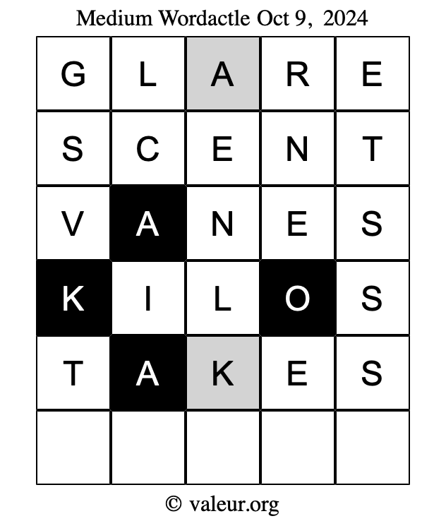 Here are the October 9, 2024 daily four Wordactle puzzles. You are welcome to print a copy of the puzzles and solve them by hand. For your convenience, we have also included the solutions further down the page so you can check your work.