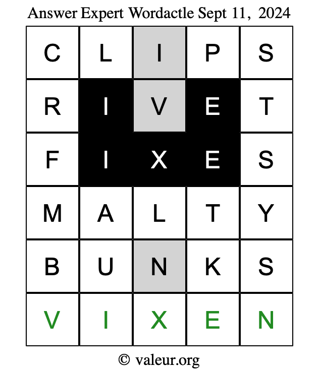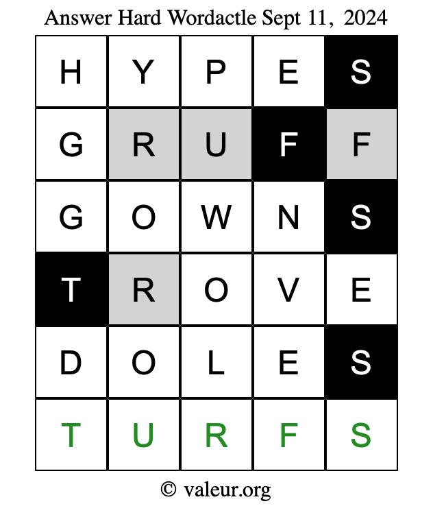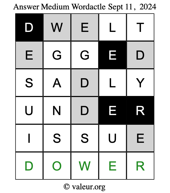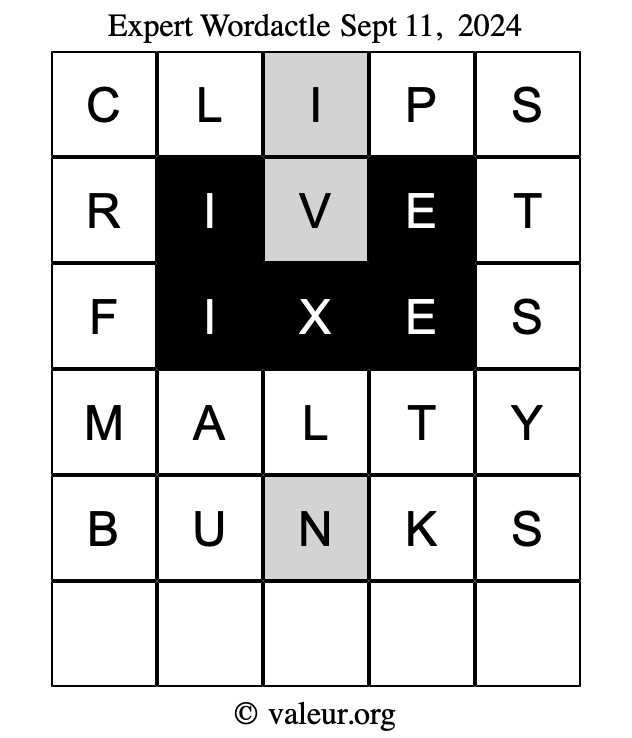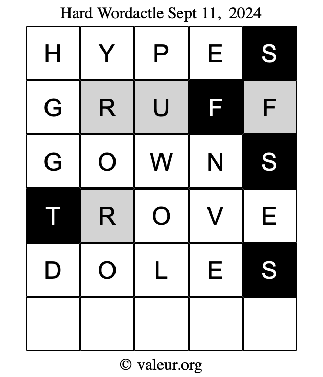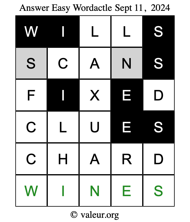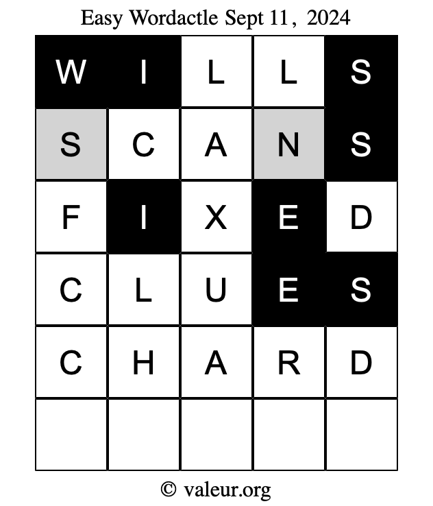 Here are the September 11, 2024 daily four Wordactle puzzles. You are welcome to print a copy of the puzzles and solve them by hand. For your convenience, we have also included the solutions further down the page so you can check your work.