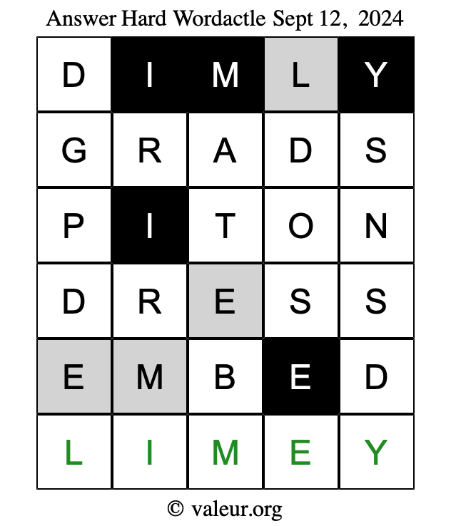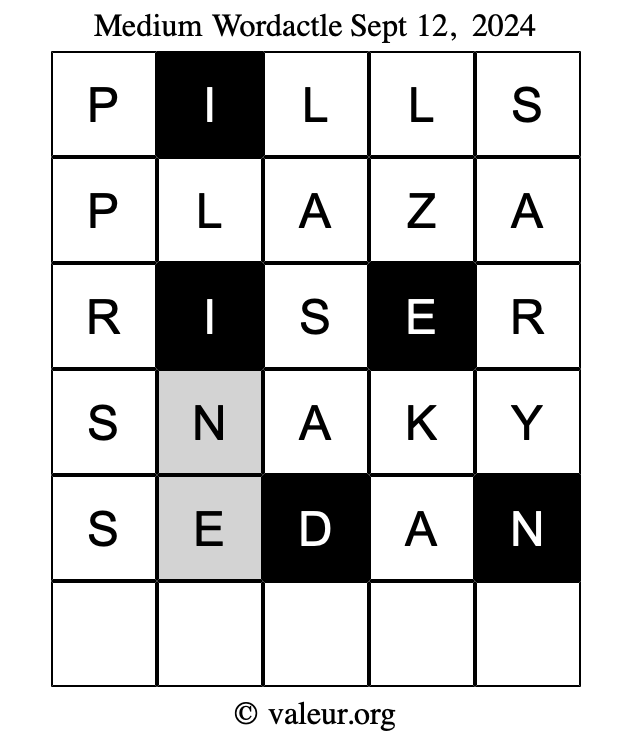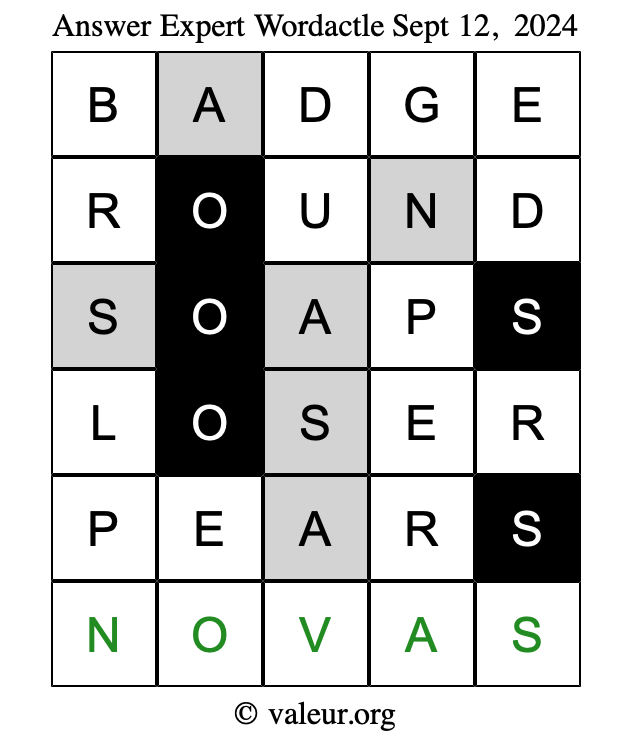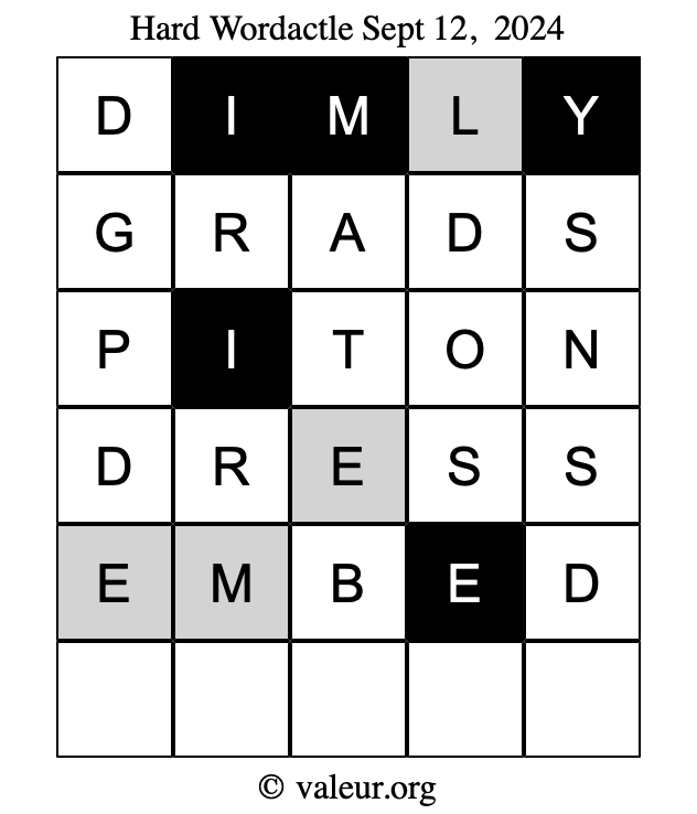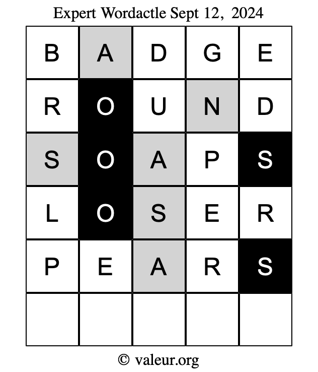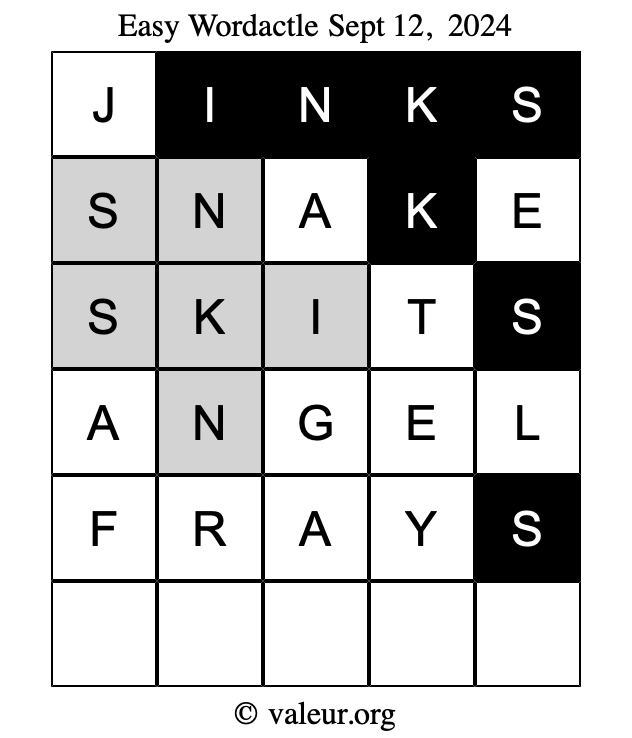 Here are the September 12, 2024 daily four Wordactle puzzles. You are welcome to print a copy of the puzzles and solve them by hand. For your convenience, we have also included the solutions further down the page so you can check your work.