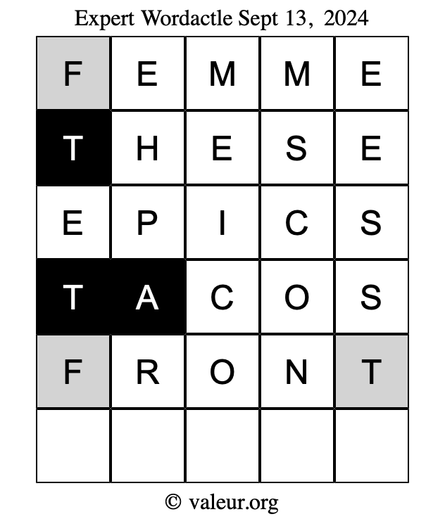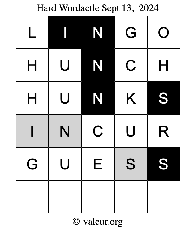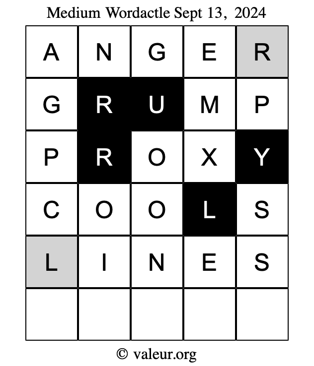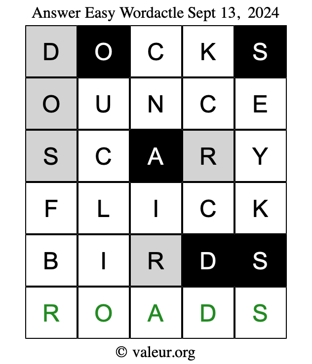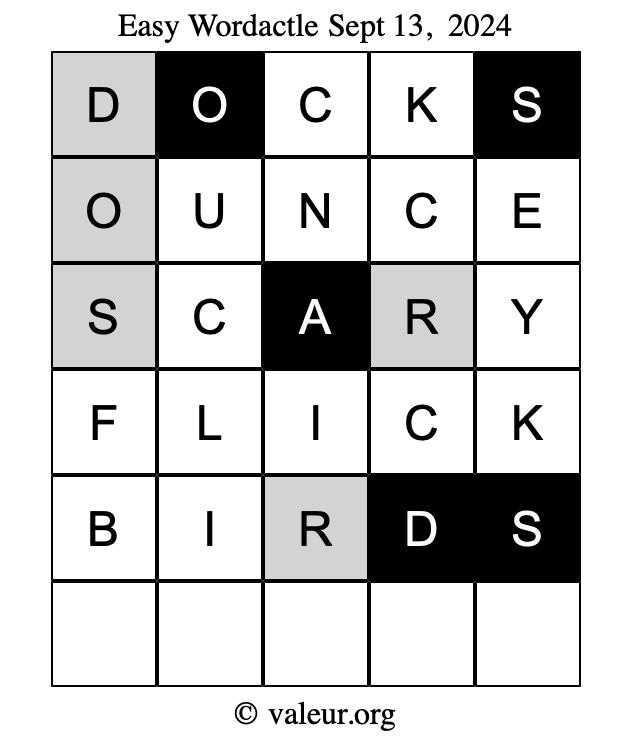 Here are the September 13, 2024 daily four Wordactle puzzles. You are welcome to print a copy of the puzzles and solve them by hand. For your convenience, we have also included the solutions further down the page so you can check your work.
