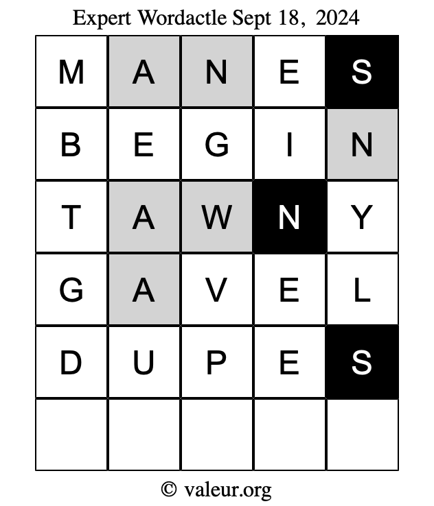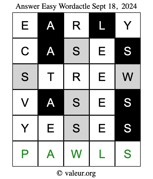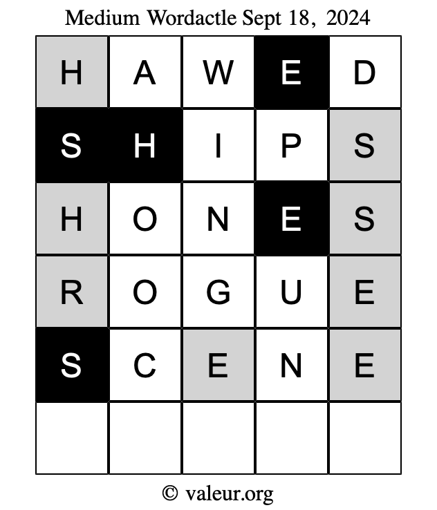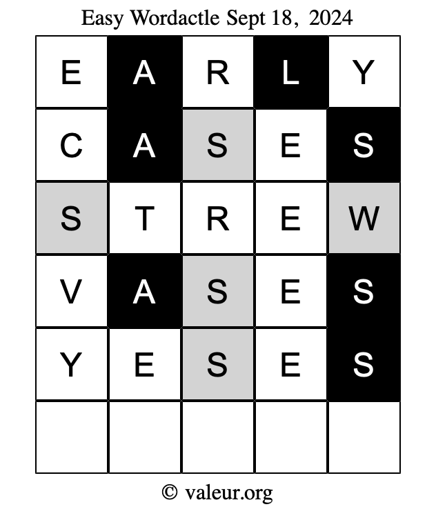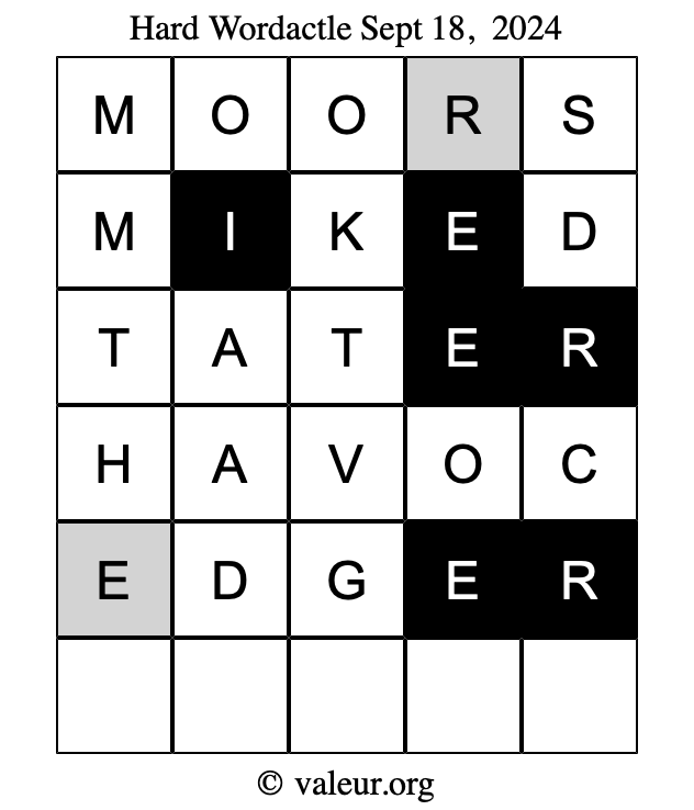 Here are the September 18, 2024 daily four Wordactle puzzles. You are welcome to print a copy of the puzzles and solve them by hand. For your convenience, we have also included the solutions further down the page so you can check your work.