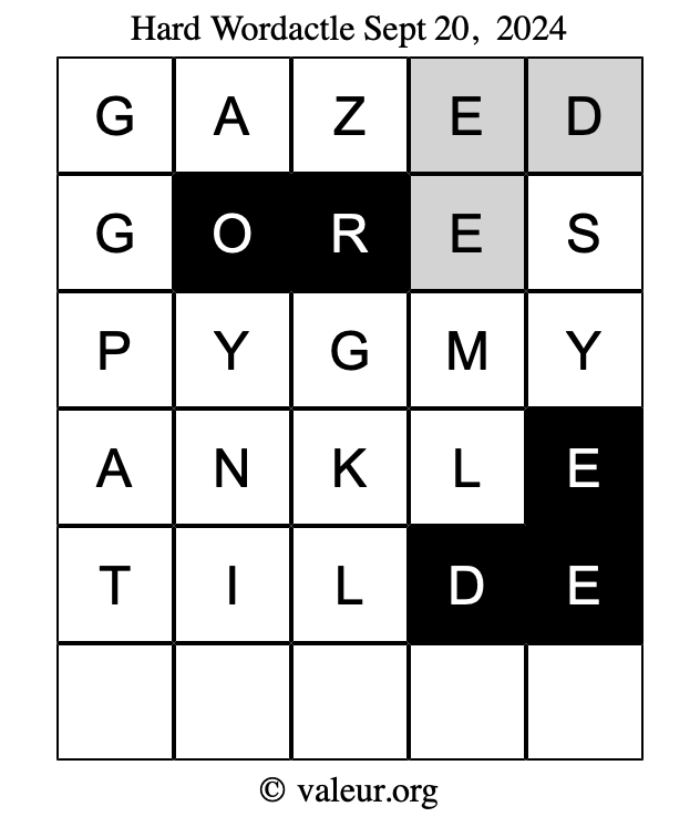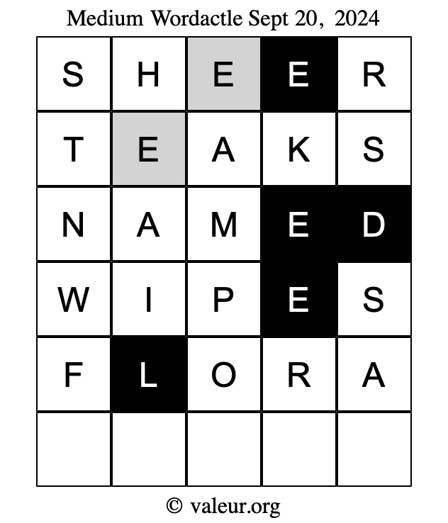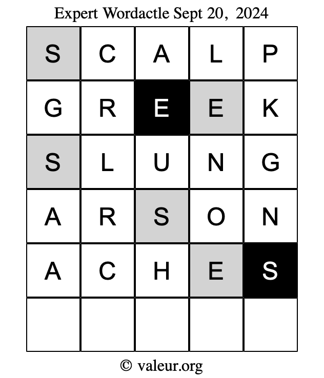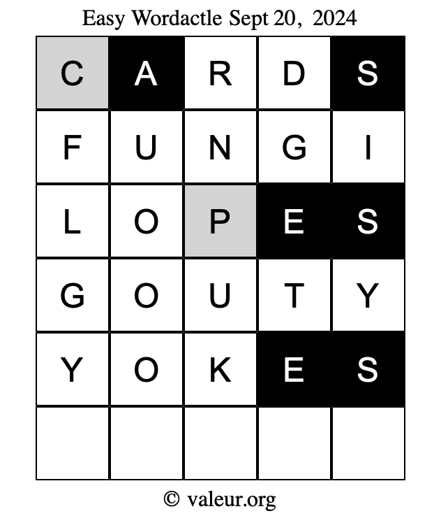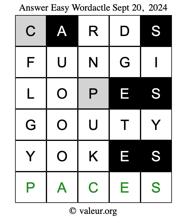 Here are the September 20, 2024 daily four Wordactle puzzles. You are welcome to print a copy of the puzzles and solve them by hand. For your convenience, we have also included the solutions further down the page so you can check your work.