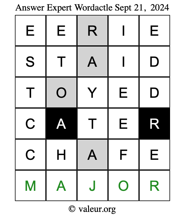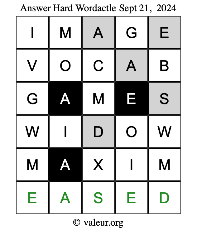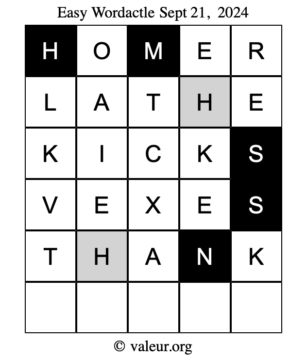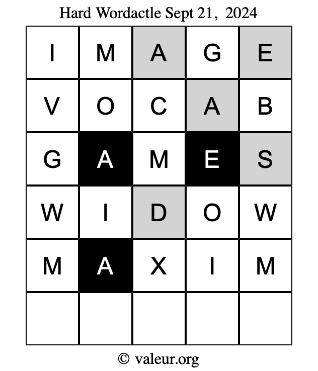 Here are the September 21, 2024 daily four Wordactle puzzles. You are welcome to print a copy of the puzzles and solve them by hand. For your convenience, we have also included the solutions further down the page so you can check your work.
