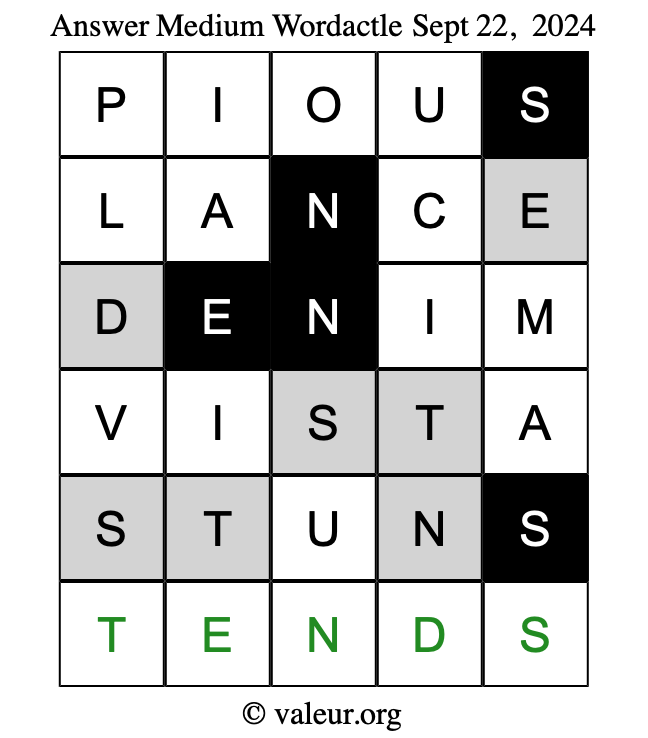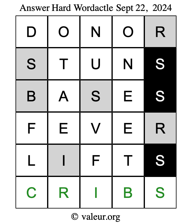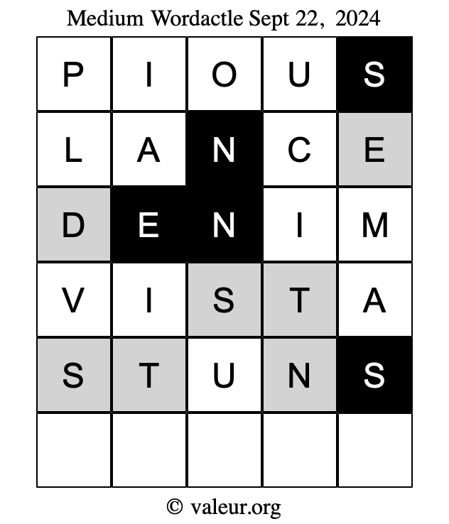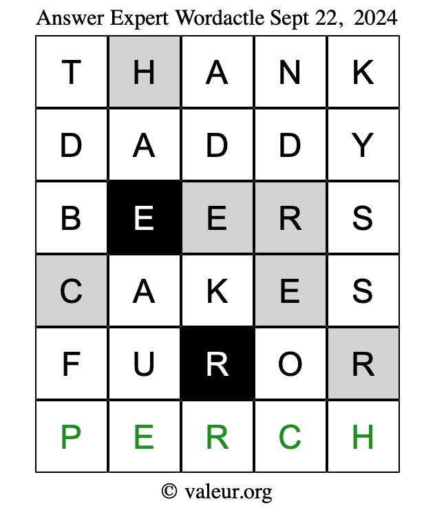 Here are the September 22, 2024 daily four Wordactle puzzles. You are welcome to print a copy of the puzzles and solve them by hand. For your convenience, we have also included the solutions further down the page so you can check your work.