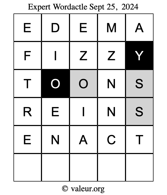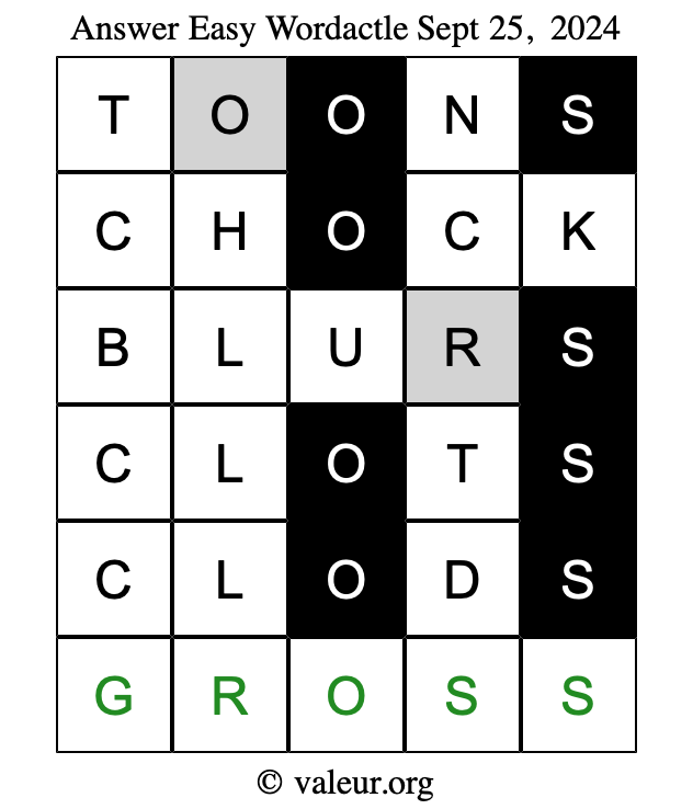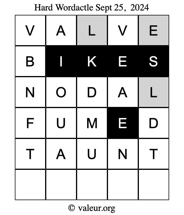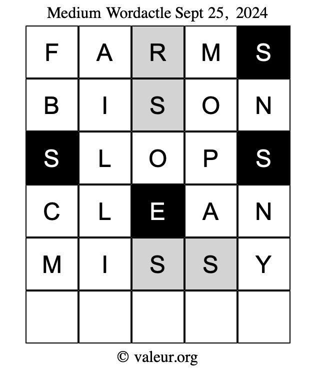 Here are the September 25, 2024 daily four Wordactle puzzles. You are welcome to print a copy of the puzzles and solve them by hand. For your convenience, we have also included the solutions further down the page so you can check your work.