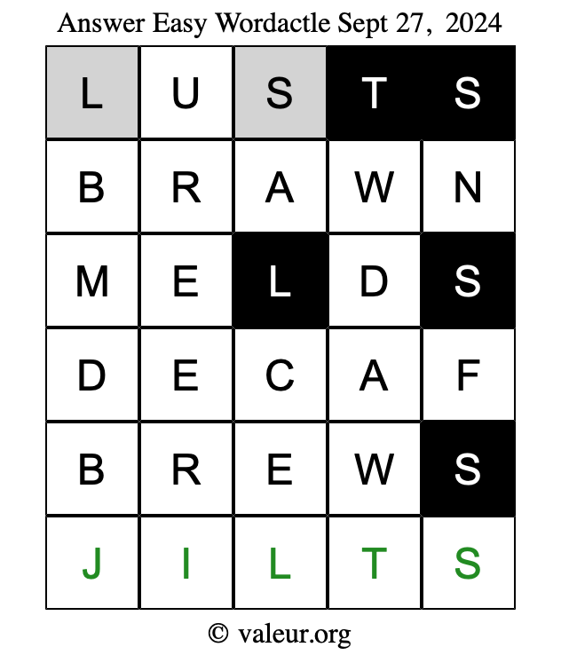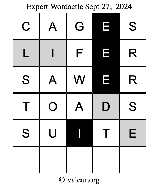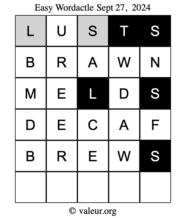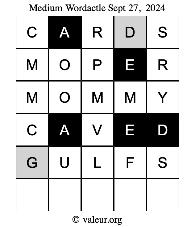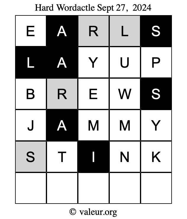 Here are the September 27, 2024 daily four Wordactle puzzles. You are welcome to print a copy of the puzzles and solve them by hand. For your convenience, we have also included the solutions further down the page so you can check your work.