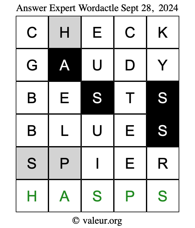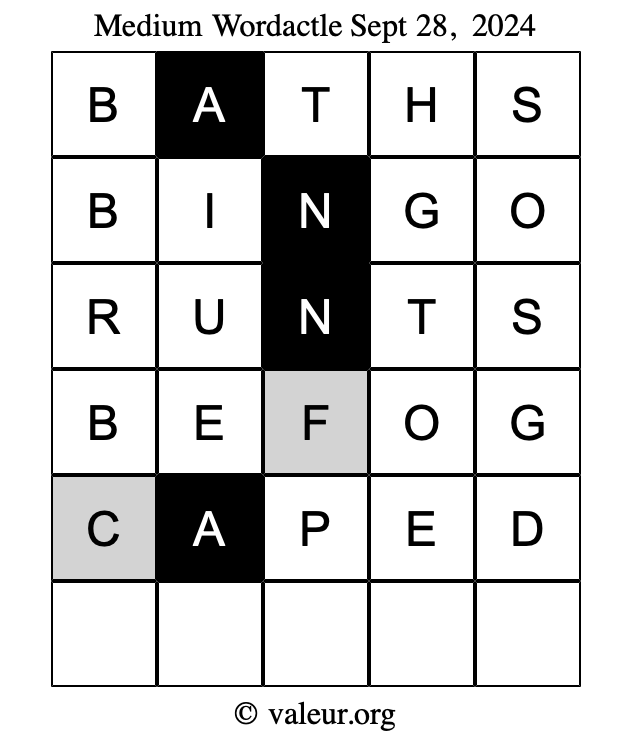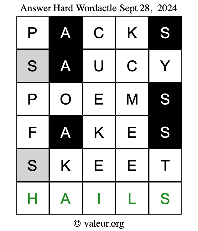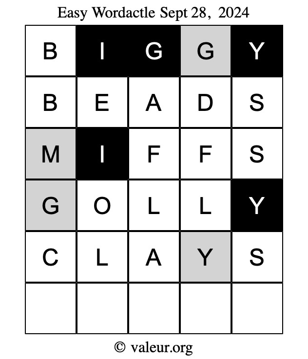 Here are the September 28, 2024 daily four Wordactle puzzles. You are welcome to print a copy of the puzzles and solve them by hand. For your convenience, we have also included the solutions further down the page so you can check your work.