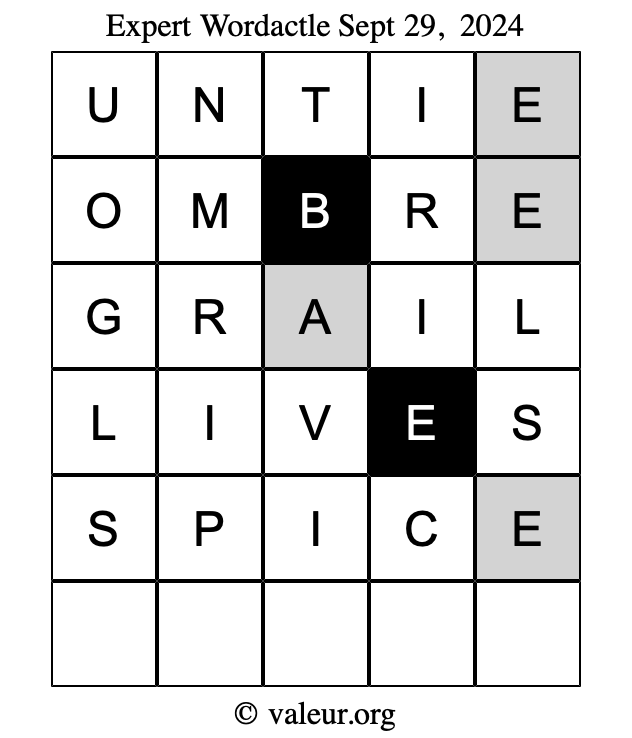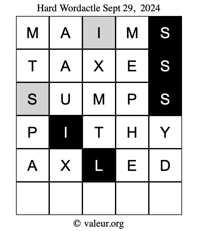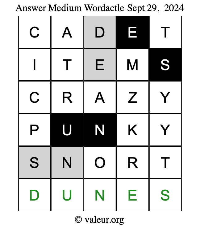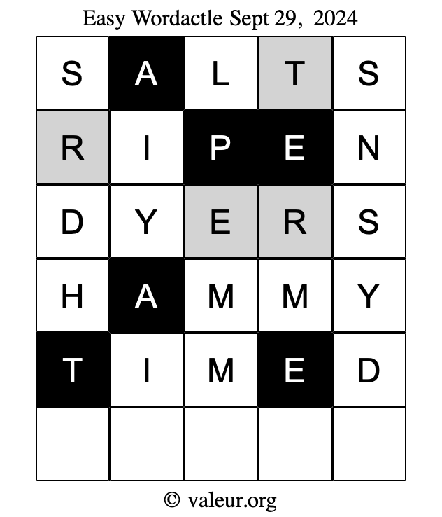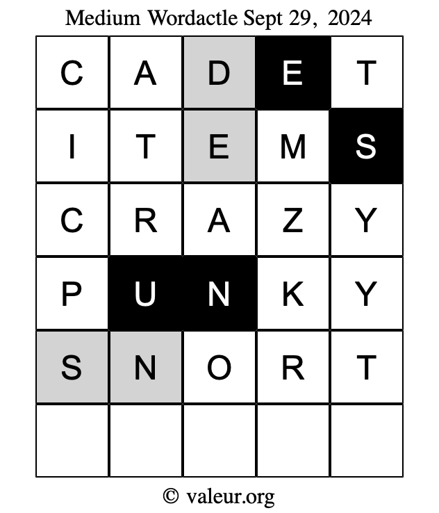 Here are the September 29, 2024 daily four Wordactle puzzles. You are welcome to print a copy of the puzzles and solve them by hand. For your convenience, we have also included the solutions further down the page so you can check your work.