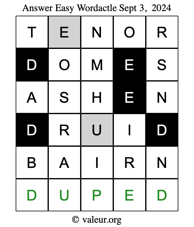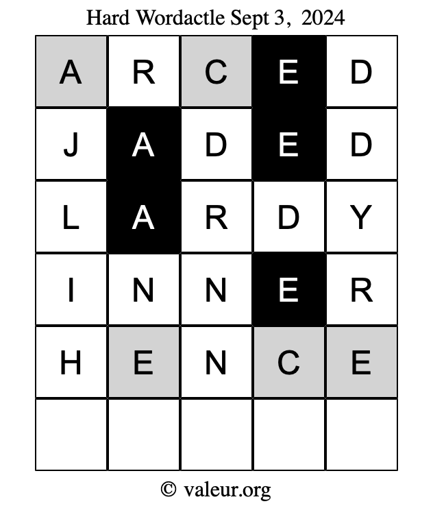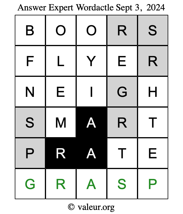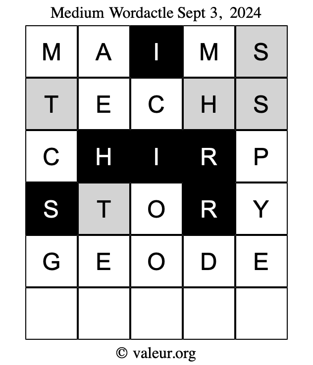 Here are the September 3, 2024 daily four Wordactle puzzles. You are welcome to print a copy of the puzzles and solve them by hand. For your convenience, we have also included the solutions further down the page so you can check your work.